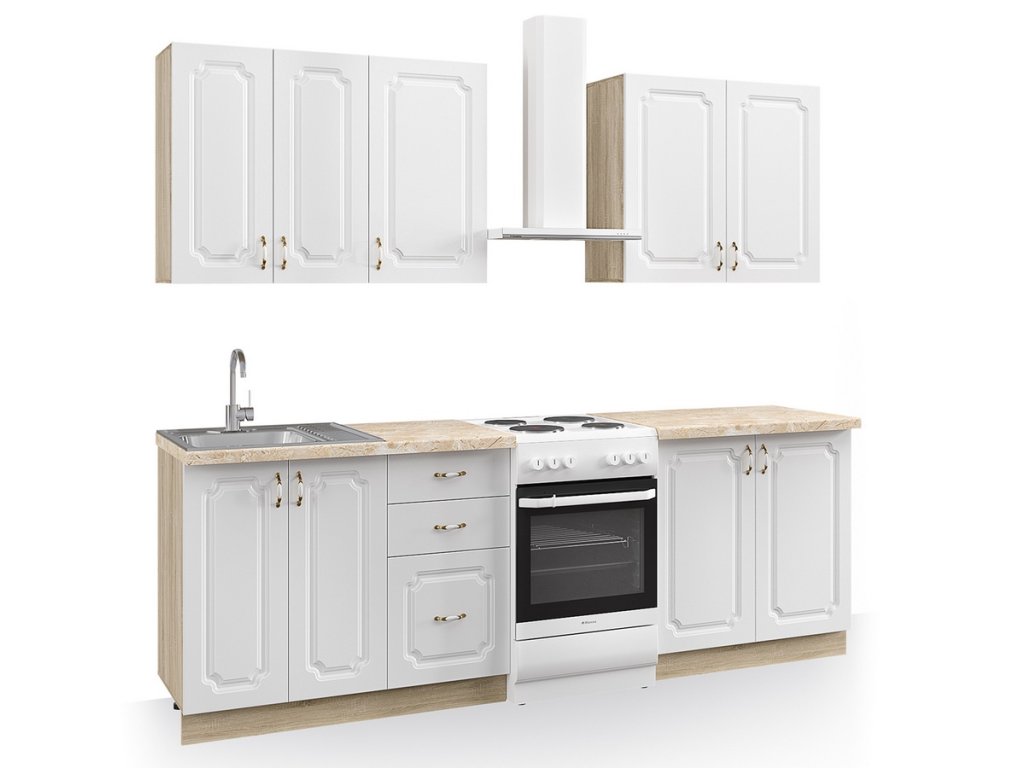 Tato moderní kuchyně kombinuje praktičnost a jednoduchý design. Skříňky se dají poskládat v libovolném pořadí a to Vám umožní si sestavit kuchyni podle svých představ. Korpus a sokl jsou z kvalitní LTD desky v barvě dub sonoma, dvířka jsou z MDF s ozdobným dekorem v barvě bílá v supermat. Úchyty jsou porcelánové provánského stylu. Zásuvky obsahují teleskopické výsuvy. Sestava se skládá ze spodních skříněk - výška 82 cm, hloubka 47 cm, (s pracovní deskou výška 85 cm, hloubka 60 cm), šířka: - 60 cm skříňka pod dřez 2-dveřová - 80 cm skříňka 2-dveřová - 40 cm skříňka se 3 zásuvkami - a vrchních skříněk - výška 72 cm, hloubka 32 cm, šířka: - 80 cm skříňka 2-dveřová - 60 cm skříňka 2-dveřová - 40 cm skříňka 1-dveřová Kuchyně se prodává jako sestava, dokoupení skříněk není možné. Pracovní deska, spotřebiče, dřez a digestoř nejsou součástí kuchyně. Dřez a pracovní desky k zakoupení najdete v naší další nabídce. Dodáváme v demontovaném stavu.Doplňkové parametry