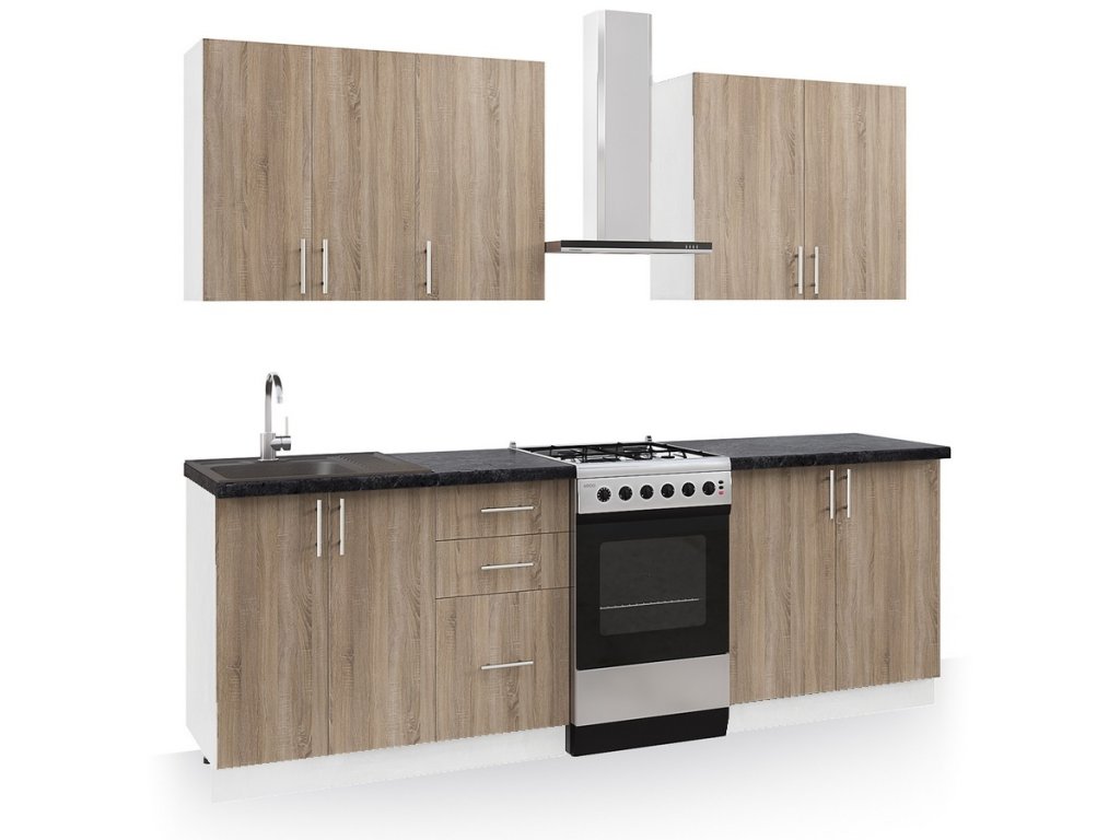 Tato moderní kuchyně kombinuje praktičnost a jednoduchý design. Skříňky se dají poskládat v libovolném pořadí a to Vám umožní si sestavit kuchyni podle svých představ. Korpus a sokl jsou z kvalitní LTD desky v barvě bílé, dvířka jsou v barvě dub sonoma lanýžová. Úchyty jsou stříbrné plastové. Sestava se skládá ze spodních skříněk - výška 82 cm, hloubka 47 cm, (s pracovní deskou výška 85 cm, hloubka 60 cm), šířka: - 60 cm skříňka pod dřez 2-dveřová - 80 cm skříňka 2-dveřová - 40 cm skříňka se 3 zásuvkami - a vrchních skříněk - výška 72 cm, hloubka 32 cm, šířka: - 80 cm skříňka 2-dveřová - 60 cm skříňka 2-dveřová - 40 cm skříňka 1-dveřová Kuchyně se prodává jako sestava, dokoupení skříněk není možné. Pracovní deska, spotřebiče, dřez a digestoř nejsou součástí kuchyně. Dřez a pracovní desky k zakoupení najdete v naší další nabídce. Dodáváme v demontovaném stavu.Doplňkové parametry