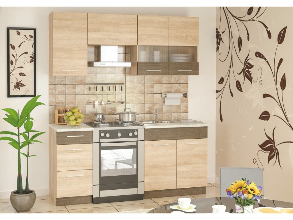 Kuchyně v moderním stylu. Tato kuchyně je navržena tak, že skříňky se dají poskládat v libovolném pořadí. To vám umožní si sestavit kuchyni podle svých představ. Korpus, sokl i dvířka jsou z kvalitní LTD desky v barevné kombinaci dub sonoma/rivera lanýž. Úchyty jsou ve stříbrné barvě. Sestava se skládá ze spodních skříněk - výška 82 cm, hloubka 44,5 cm, šířka: - 80 cm skříňka pod dřez - 40 cm skříňka se 3 zásuvkami - a vrchních skříněk - výška 72 cm, nad digestoří 36 cm, hloubka 28,5 cm, šířka: - 80 cm vitrína 2-dveřová - 40 cm skříňka 1-dveřová - 60 cm skříňka výklopná nad digestoř Kuchyně se prodává jako sestava, dokoupení skříněk není možné. Pracovní deska, spotřebiče, dřez a digestoř nejsou součástí kuchyně. Dřez a pracovní desky k zakoupení najdete v naší další nabídce. Dodáváme v demontovaném stavu.Doplňkové parametry