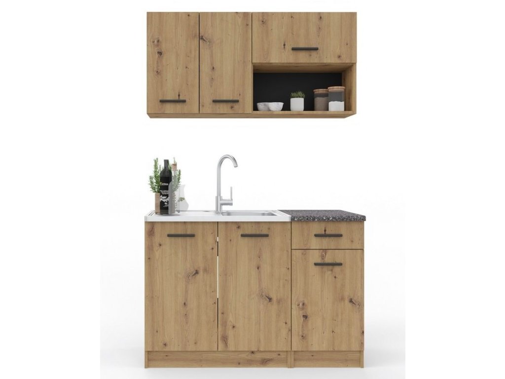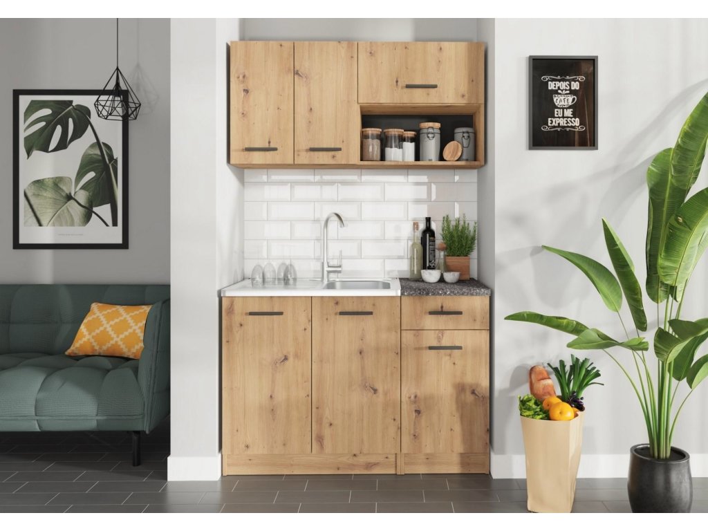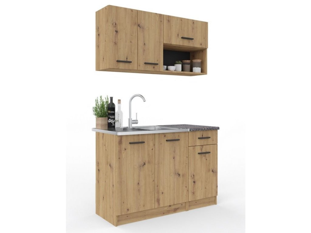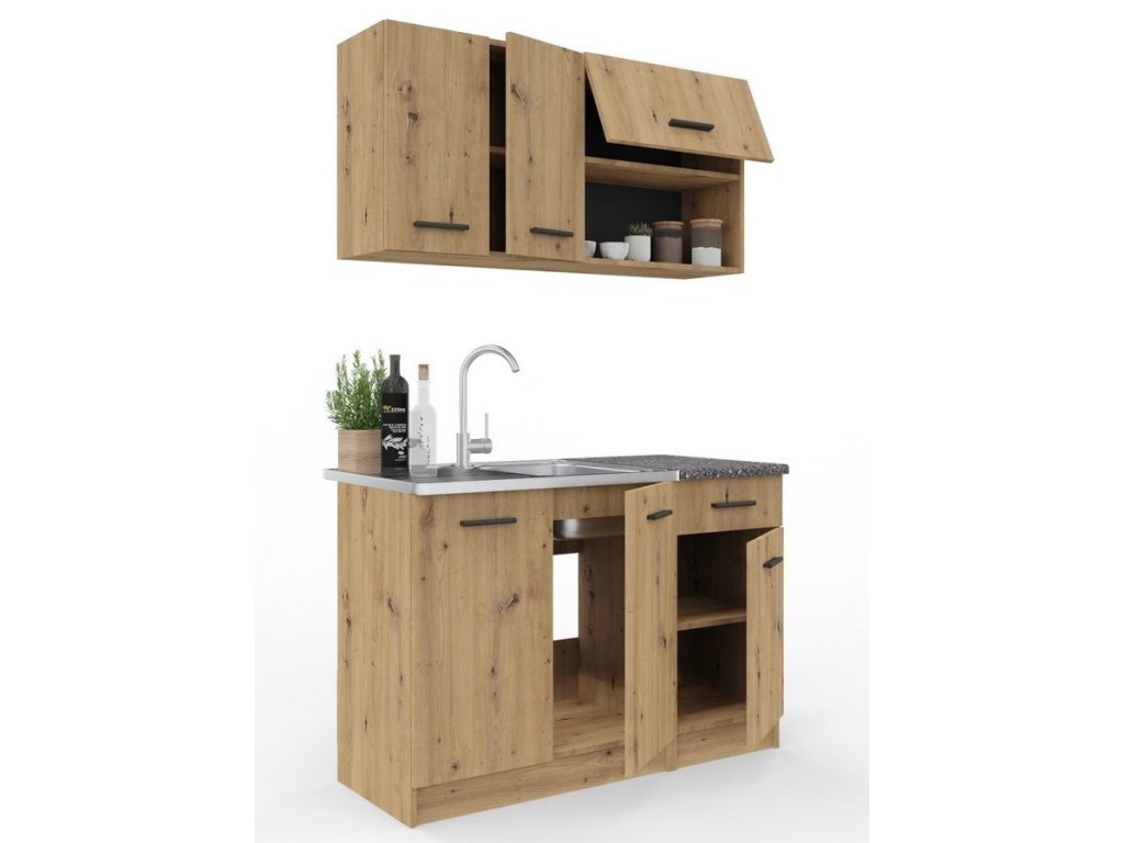 Moderní levná kuchyně. Korpus, sokl i dvířka jsou v barvě dub artisan barvy. Spotřebiče, dřez a digestoř v ceně nejsou. Dřez k zakoupení najdete v naší nabídce. Sestava se skládá ze spodních skříněk - výška 84 s PD cm, hloubka 46 cm, šířka: - 80 cm skříňka 2-dveřová pod dřez bez pracovní desky - 40 cm skříňka 1-dveřová se zásuvkou, včetně pracovní desky v barvě grafit a vrchní skříňky: - šířka 120 cm, výška 58 cm, hloubka 30 cm. Tato sestava se prodává pouze jako celek, dokoupit jednotlivé skříňky není možné. Dodáváme v demontovaném stavu.Doplňkové parametry