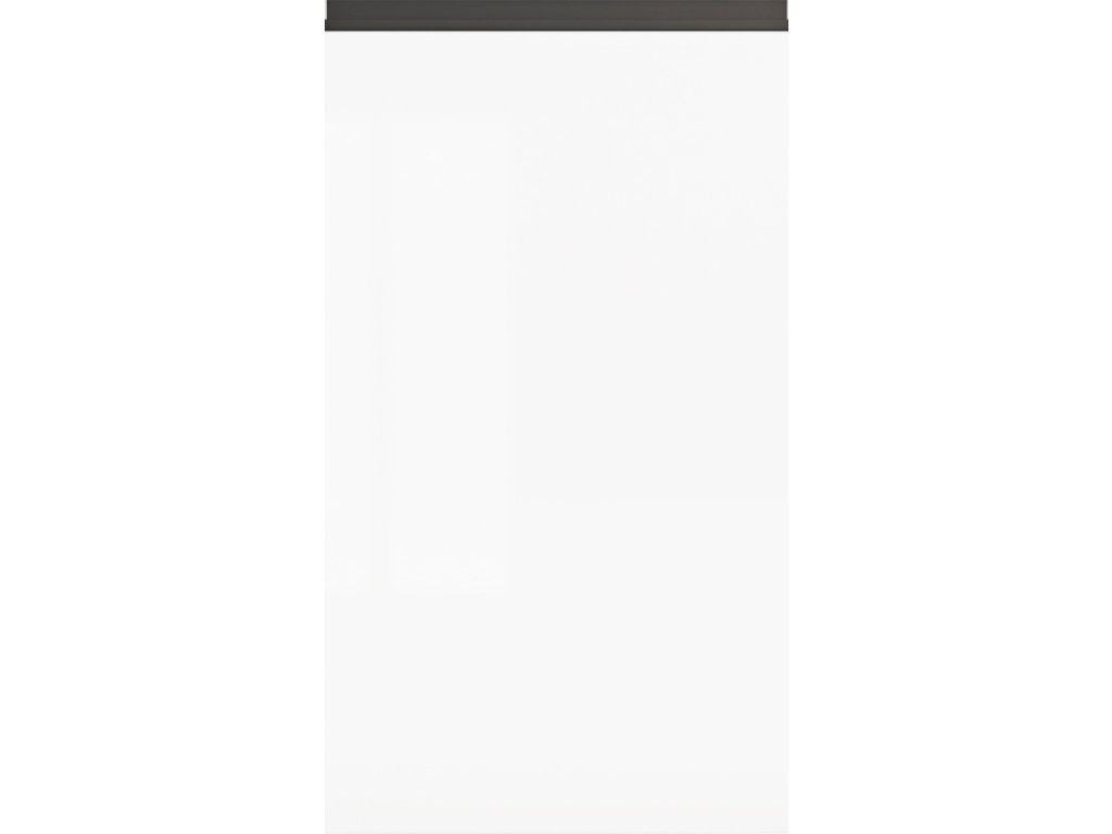 Materiál LTD, korpus je v šedé barvě, dvířka jsou v bílém provedení s integrovanými úchytkami.