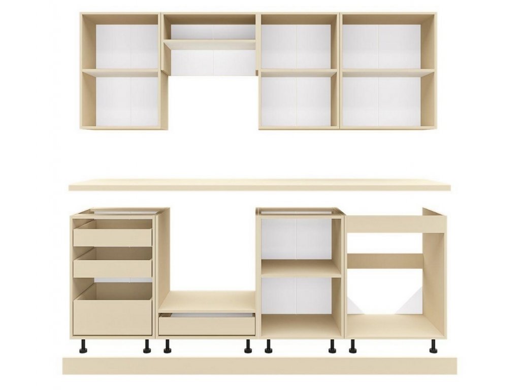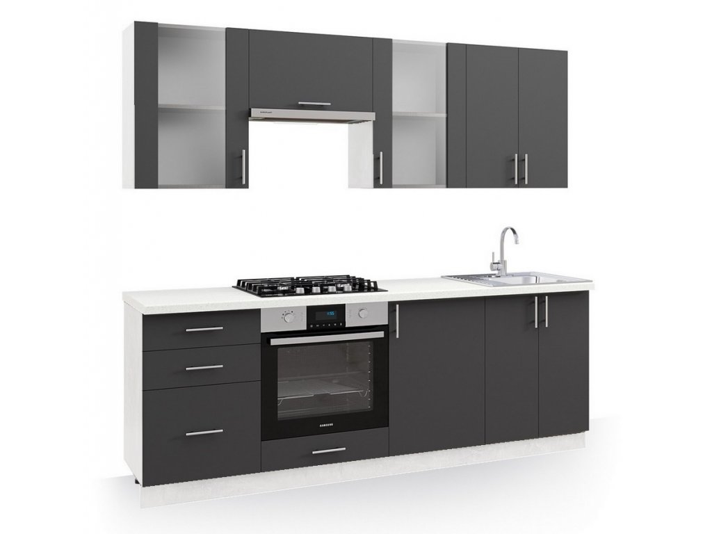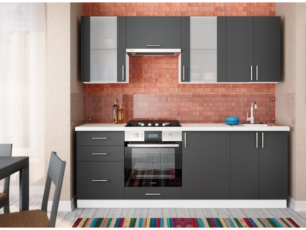 Tato moderní kuchyně kombinuje praktičnost a jednoduchý design. Skříňky se dají poskládat v libovolném pořadí a to Vám umožní si sestavit kuchyni podle svých představ. Korpus a sokl jsou z kvalitní LTD desky v barvě bílé, dvířka jsou v barvě antracit. Úchyty jsou stříbrné plastové. Sestava se skládá ze spodních skříněk - výška 82 cm, hloubka 47 cm, (s pracovní deskou výška 85 cm, hloubka 60 cm), šířka: - 60 cm skříňka pod dřez 2-dveřová - 50 cm skříňka se 3 zásuvkami - 50 cm skříňka 1-dveřová - 60 cm skříňka na vestavnou troubu - a vrchních skříněk - výška 72 cm, nad digestoří 36 cm, hloubka 32 cm, šířka: - 60 cm skříňka 2-dveřová - 2x 50 cm vitrína 1-dveřová - 60 cm výklopná skříňka nad digestoř Kuchyně se prodává jako sestava, dokoupení skříněk není možné. Pracovní deska, spotřebiče, dřez a digestoř nejsou součástí kuchyně. Dřez a pracovní desky k zakoupení najdete v naší další nabídce. Dodáváme v demontovaném stavu.Doplňkové parametry
