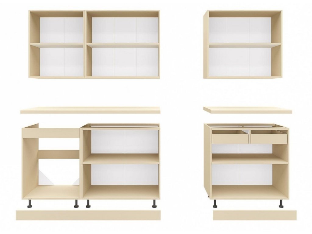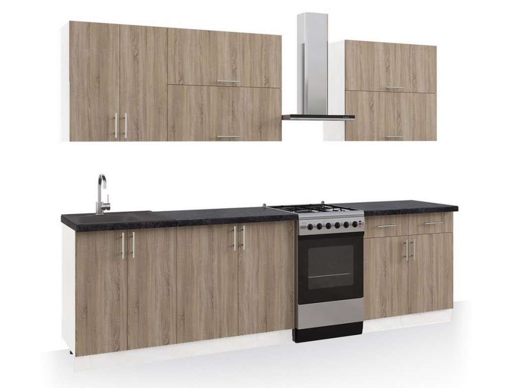 Tato moderní kuchyně kombinuje praktičnost a jednoduchý design. Skříňky se dají poskládat v libovolném pořadí a to Vám umožní si sestavit kuchyni podle svých představ. Korpus a sokl jsou z kvalitní LTD desky v barvě bílé, dvířka jsou v barvě dub sonoma lanýžová. Úchyty jsou stříbrné plastové. Sestava se skládá ze spodních skříněk - výška 82 cm, hloubka 47 cm, (s pracovní deskou výška 85 cm, hloubka 60 cm), šířka: - 60 cm skříňka pod dřez 2-dveřová - 80 cm skříňka 2-dveřová - 80 cm skříňka 2-dveřová se zásuvkami - a vrchních skříněk - výška 72 cm, hloubka 32 cm, šířka: - 60 cm skříňka 2-dveřová - 2x 80 cm skříňka výklopná 2-dveřová Kuchyně se prodává jako sestava, dokoupení skříněk není možné. Pracovní deska, spotřebiče, dřez a digestoř nejsou součástí kuchyně. Dřez a pracovní desky k zakoupení najdete v naší další nabídce. Dodáváme v demontovaném stavu.Doplňkové parametry