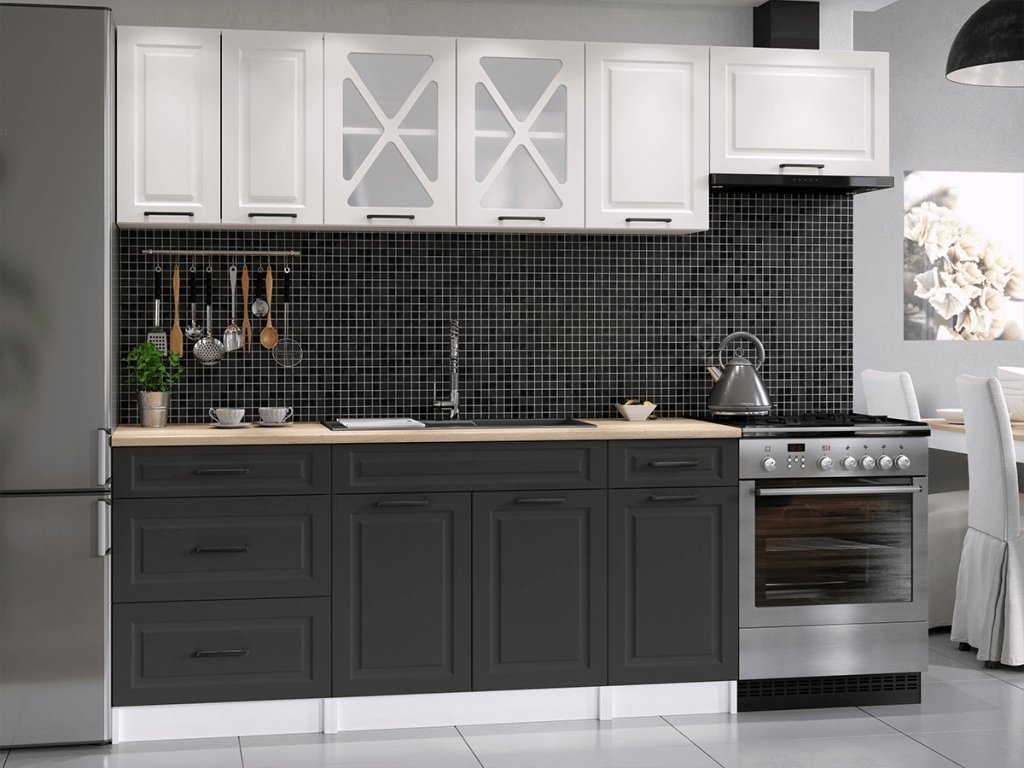 Kuchyňská linka Magda je vyrobená ve venkovském stylu, který se hodí do kuchyně v paneláku i v rodinném domě. Tento styl má jedinečnou schopnost proměnit Vaši kuchyň v útulnou a zároveň funkční místnost, kde bude radost vařit i péct. Kuchyňská linka Magda nabízí dostatek úložného i pracovního prostoru. Všechny skříňky jsou samostatné, takže si je můžete sestavit tak, jak Vám to vyhovuje. Korpusy skříněk jsou vyrobené z lamina 18 mm s hranami ABS a dvířka jsou MDF 16mm. Všechny skříňky jsou dodávány v demontu. Součástí balení je montážní plánek včetně všech potřebných spojovacích prvků. Cena je uvedna za sestavu vyobrazenou na úvodní fotografii BEZ PRACOVNÍ DESKY, s úchytkami, které jsou vyobrazeny v doplňkových fotografiích. Pracovní desku lze dokoupit nad každou skříňku zvlášť podle její šíře. Vyobrazené spotřebiče, dřez, baterie, doplňky a dekorace nejsou v ceně. Kuchyň bude dodaná s bílými korpusy a dvířky v kombinaci bílá a grafit.