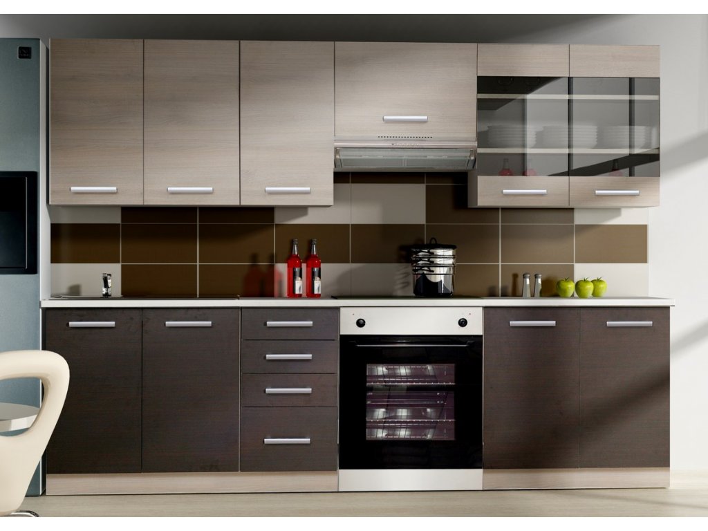 Moderní a levná kuchyně. Tato kuchyně je navržena tak, že skříňky se dají poskládat v libovolném pořadí, popřípadě další doobjednat. To vám umožní si sestavit kuchyni podle svých představ. Korpus i sokl jsou barvy dub ferrara, dvířka jsou vyrobená z kvalitní LTD, spodní dvířka jsou v barvě dub tmavé legno, horní skříňky v barvě dub ferrara. Pracovní deska není v ceně. Spotřebiče, dřez a digestoř v ceně nejsou. Sestava se skládá ze spodních skříněk - výška 82 cm, hloubka 52 cm, šířka: - 80 cm skříňka pod dřez - 60 cm skříňka dvoudveřová - 40 cm skříňka se 4 zásuvkami a vrchních skříněk - výška 71,5 cm, nad digestoří 40 cm, hloubka 31 cm, šířka: - 80 cm vitrína dvoudveřová - 60 cm skříňka dvoudveřová - 40 cm skříňka jednodveřová - 60 cm skříňka nad digestoř s vyklápěním otvíraným nahoru. V naší nabídce nabízíme možnost sestavit si ji na míru podle svých představ nebo možnost doobjednání dřezu či pracovní desky. Dodáváme v demontovaném stavu.Doplňkové parametry
