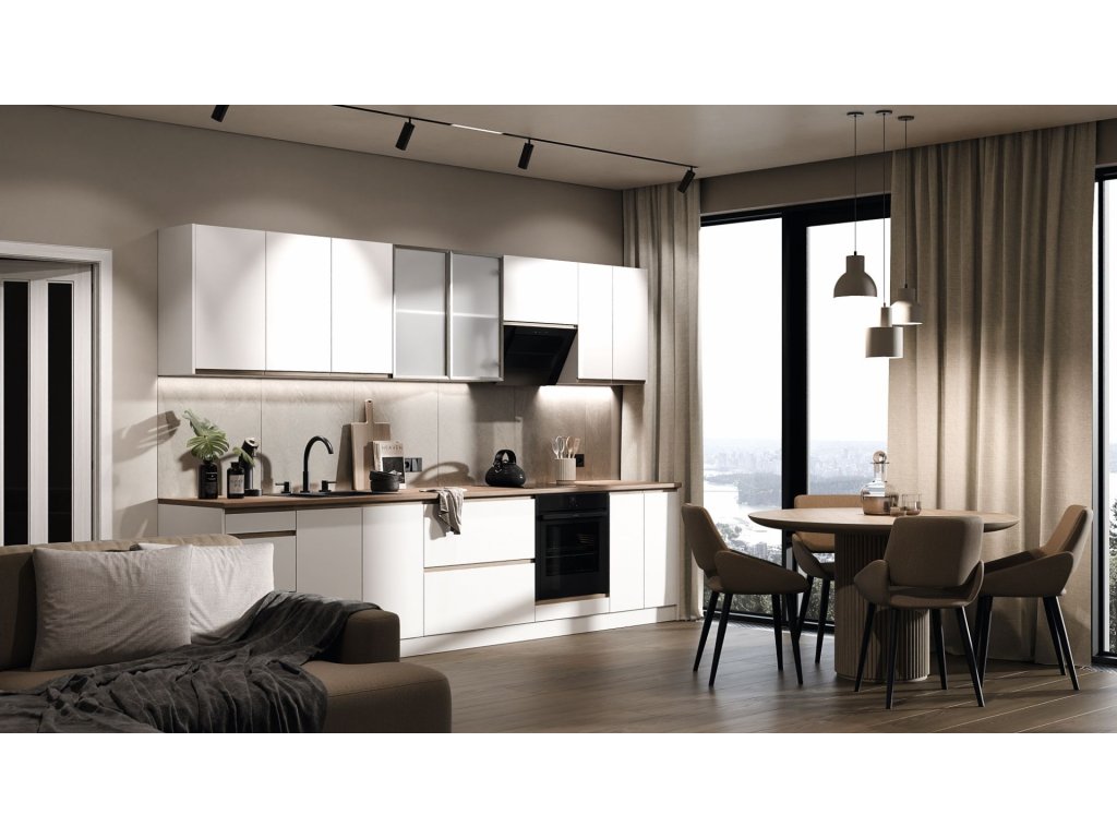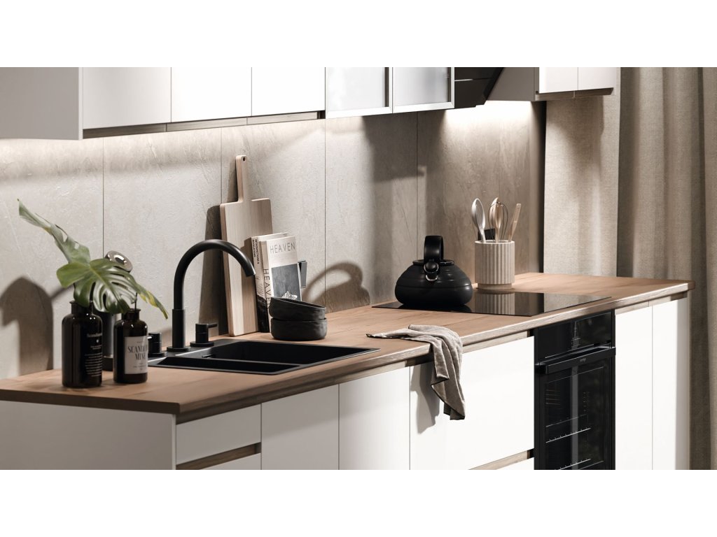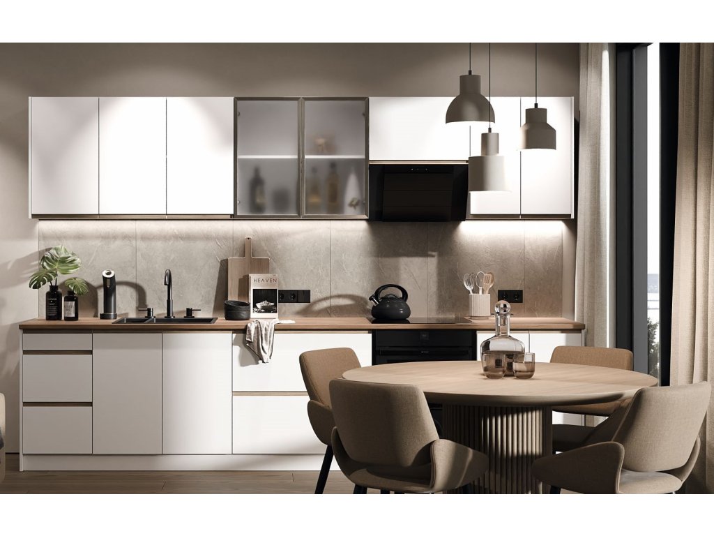 Stylová kuchyňská linka v nadčasovém barevném provedení rozzáří Vaši kuchyni. je moderní bílá kuchyňská linka, která je kombinována s dřevěným dekorem v odstínu dub Sonoma. Trendový design a nadčasová barevná kombinace zaručí, že tato kuchyňská linka bude moderní io několik let.