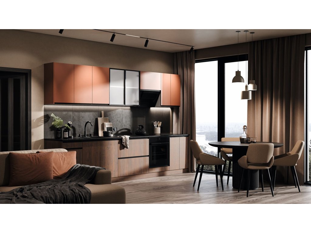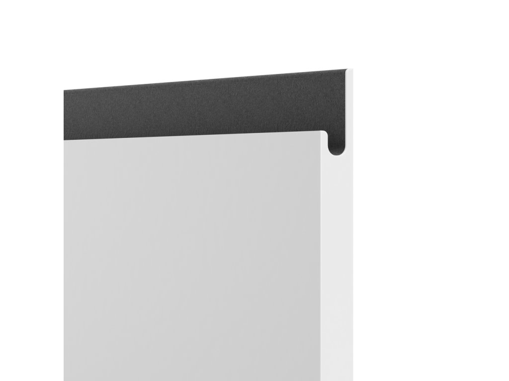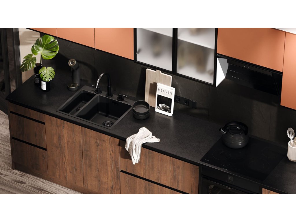 Skříňky kuchyňské linky jsou vyrobeny z kvalitní 18 mm LTD desky. Spodní skříňky mají výškově nastavitelné nožičky. Kovový rám dvířek prosklené horní skříňky je v černé barvě. Kuchyňská linka disponuje bezúchytovým systémem otevírání dvířek, což umožňují vyfrézovaná dvířka. (černá barva frézování - viz.foto)