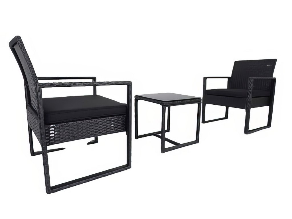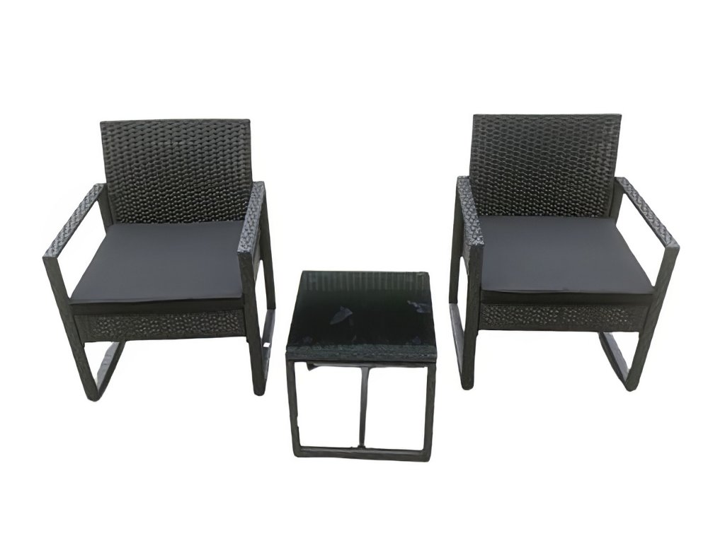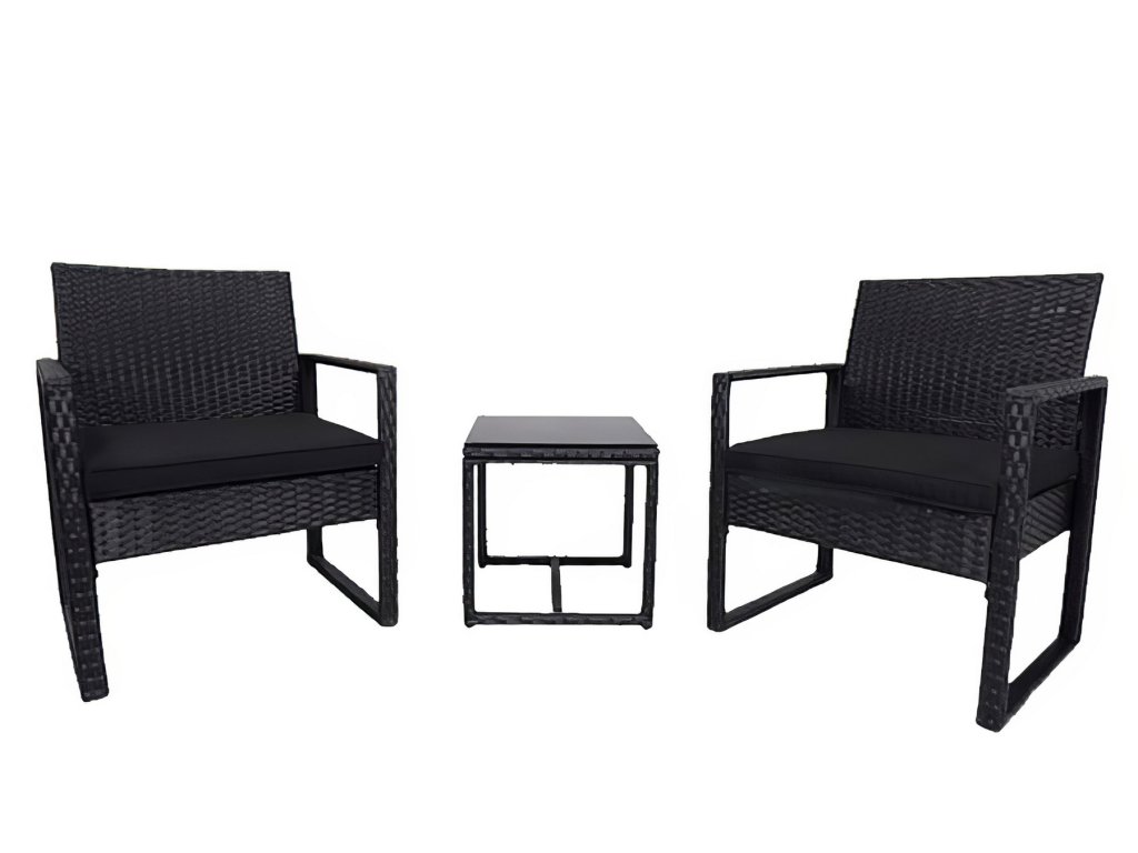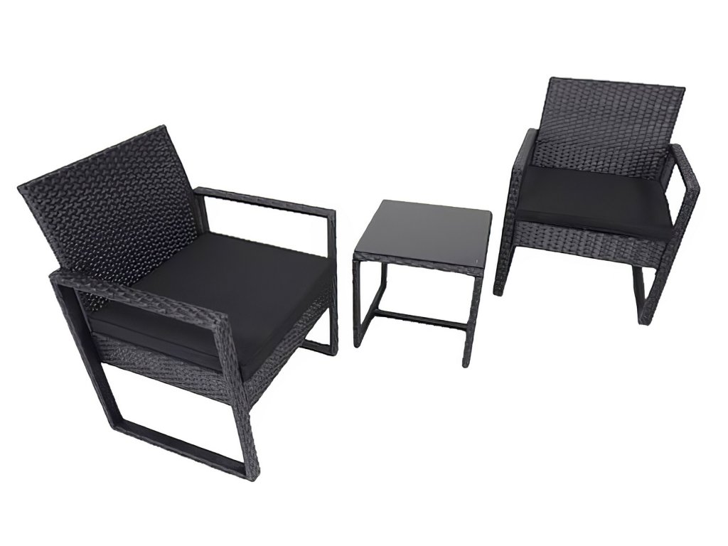 Zahradní sestava 2 křesel a 1 stolu z umělého ratanu. Díky volbě materiálu jsou křesla lehce omyvatelná a údržba není nijak náročná. Dodáváme včetně sedáků v barvě černé. Konstrukce je kovová obalená kvalitním plastem připomínající ratan. Rozměr křesla je (Š x V x H cm) - 57,5 x 75 x 56,5 cm. Výška sedu je 30,5 cm + polstrovaný sedák 5 cm. Barevné provedení - černá. Konferenční stolek s černým tvrzeným sklem s přísavkami o rozměrech (Š x V x H cm) 40 x 39 (+ sklo) x 40 cm je součástí sestavy. Dodáváme v demontovaném stavu.Doplňkové parametry