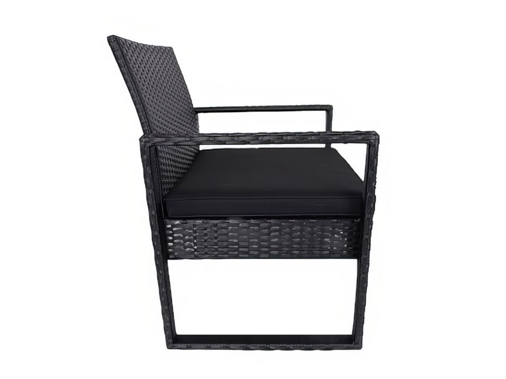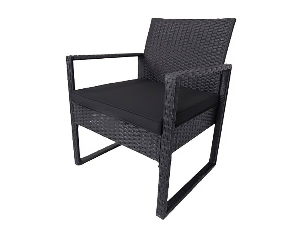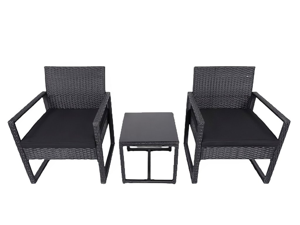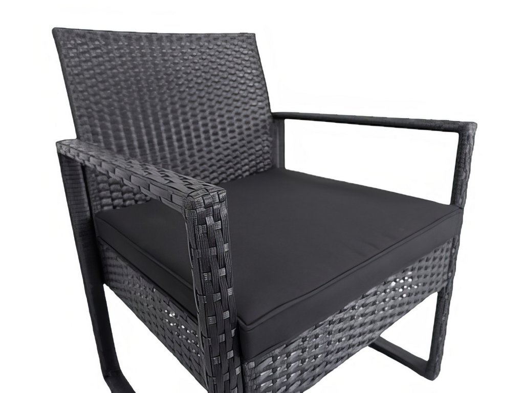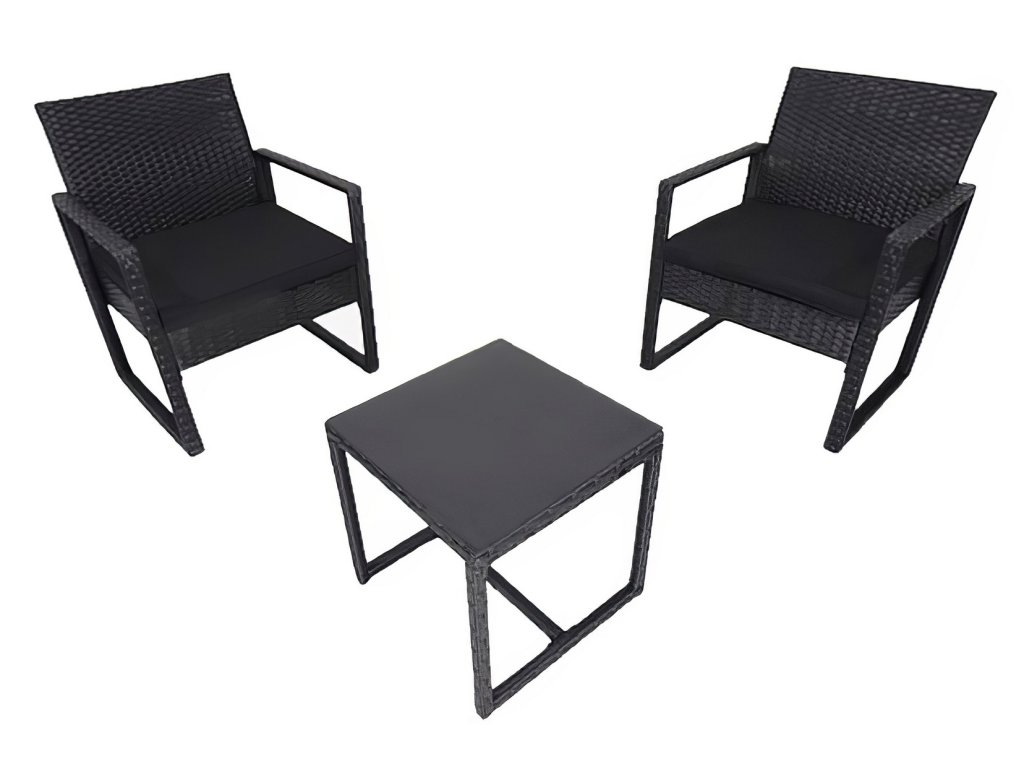 Zahradní sestava 2 křesel a 1 stolu z umělého ratanu. Díky volbě materiálu jsou křesla lehce omyvatelná a údržba není nijak náročná. Dodáváme včetně sedáků v barvě černé. Konstrukce je kovová obalená kvalitním plastem připomínající ratan. Rozměr křesla je (Š x V x H cm) - 57,5 x 75 x 56,5 cm. Výška sedu je 30,5 cm + polstrovaný sedák 5 cm. Barevné provedení - černá. Konferenční stolek s černým tvrzeným sklem s přísavkami o rozměrech (Š x V x H cm) 40 x 39 (+ sklo) x 40 cm je součástí sestavy. Dodáváme v demontovaném stavu.Doplňkové parametry