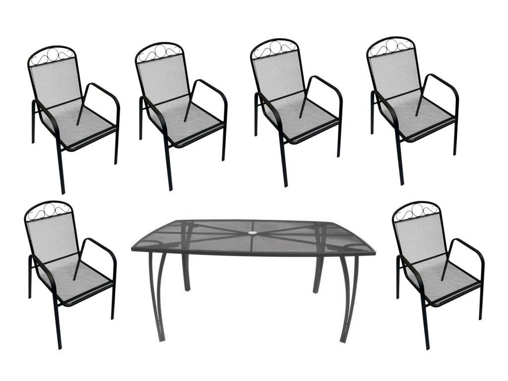 Zahradní kovová sestava se skládá z těchto komponentů, rozměry ( Š x V x H cm): 6x křeslo - ( 57 x 94 x 69 cm ) a stůl - ( 90 x 71 x 150 cm). Výška sedu křesla je cca 43 cm. Díky použitým materiálům není údržba sestavy nijak náročná. Barevné provedení - černá. Jednotlivé díly lze zakoupit zvlášť.