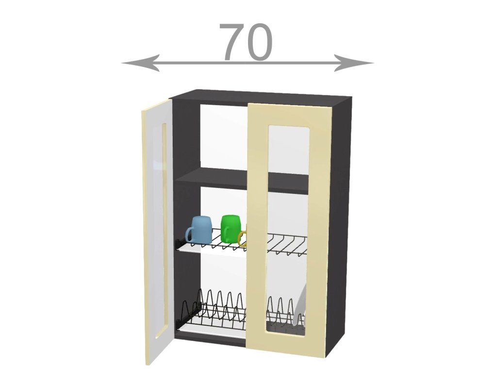 Kuchyňský sektor Capri, horní vysoká vitrína s odkapávačem, šířka 70 cm, 2 dvířka, korpus dub Sonoma, dvířka grafit. Vyšší vitrína s odkapávačem na nádobí do zástavby horních skříněk 92 cm. Představujeme vám kuchyňský sektor Capri - nejlevnější kuchyni s možností poskládat si vlastní kuchyňskou sestavu ze skříněk dle svých potřeb a prostoru. Kupujte chytře a výhodně! Kuchyňská linka na míru vás nemusí stát majlant. U kuchyně Capri máte na výběr víc jak 10 barev kuchyňských dvířek jak v dřevodekoru, tak v unikolorech. Zvolit si lze i barvu korpusu, takže výsledná kuchyňská linka na míru se bude krásně hodit do vaší kuchyně jak rozměrem tak barvou. Závěsy horních skříněk (v ceně) jsou bez možnosti regulace. V nabídce též regulovatelné závěsy. Výhodou je, že úchyty skříněk jsou součástí dvířek a tudíž jsou v ceně.Doplňkové parametry