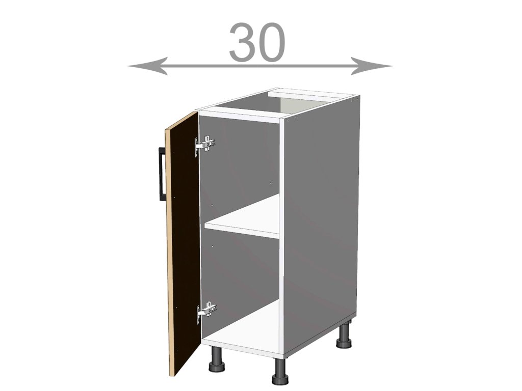 Dolní skříňka, šířka 30 cm, 1 dvířka, MDF antracit lesk, bílý korpus. Náleží do kuchyňské sektorové řady Kaiser.Moderní, exkluzivní, ale cenově dostupný. To jsou hlavní přednosti kuchyňského sektoru Kaiser. MDF dvířka jsou potažena HPL vysokotlakým laminátem a mají plastovou hranu ve shodné barvě, což zaručuje vysokou odolnost a výdrž. Nově je možné si vybrat z více než 10ti barev dvířek jak v lesku tak iv matné úpravě. Úchytka je na výběr, ostatní kování je v ceně. Na výběr je mnoho skříněk, ze kterých je možné si vytvořit vlastní sestavu podle potřeby. Pracovní deska a soklová lišta jsou na výběr a objednávají se zvlášť. Nožky dolních skříněk mají výšku 10 cm a jsou v ceně skříňky. Nabízíme také nožky 15 cm. Úchytky ke skříňce se objednávají zvlášť. Na výběr je více než 10 typů úchytek, takže lze vybrat dle vašeho vkusu. Dvířka jsou již předvrtána na rozteč 128 mm.Doplňkové parametry