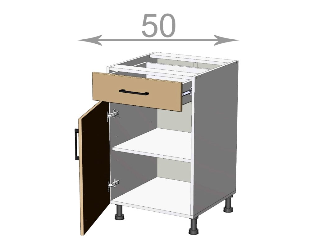 Dolní skříňka se šuplíkem, šířka 50 cm, 1 šuplík, 1 dvířka, MDF kouř mat, bílý korpus. Náleží do kuchyňské sektorové řady Kaiser. Účelně řešená skříňka s jedním šuplíkem vhodným pro příbory a dvířky pod tímto šuplíkem. Moderní, exkluzivní, ale cenově dostupný. To jsou hlavní přednosti kuchyňského sektoru Kaiser. MDF dvířka jsou potažena HPL vysokotlakým laminátem a mají plastovou hranu ve shodné barvě, což zaručuje vysokou odolnost a výdrž. Nově je možné si vybrat z více než 10ti barev dvířek jak v lesku tak iv matné úpravě. Úchytka je na výběr, ostatní kování je v ceně. Na výběr je mnoho skříněk, ze kterých je možné si vytvořit vlastní sestavu podle potřeby. Pracovní deska a soklová lišta jsou na výběr a objednávají se zvlášť. Nožky dolních skříněk mají výšku 10 cm a jsou v ceně skříňky. Nabízíme také nožky 15 cm. Úchytky ke skříňce se objednávají zvlášť. Na výběr je více než 10 typů úchytek, takže lze vybrat dle vašeho vkusu. Dvířka jsou již předvrtána na rozteč 128 mm.Doplňkové parametry