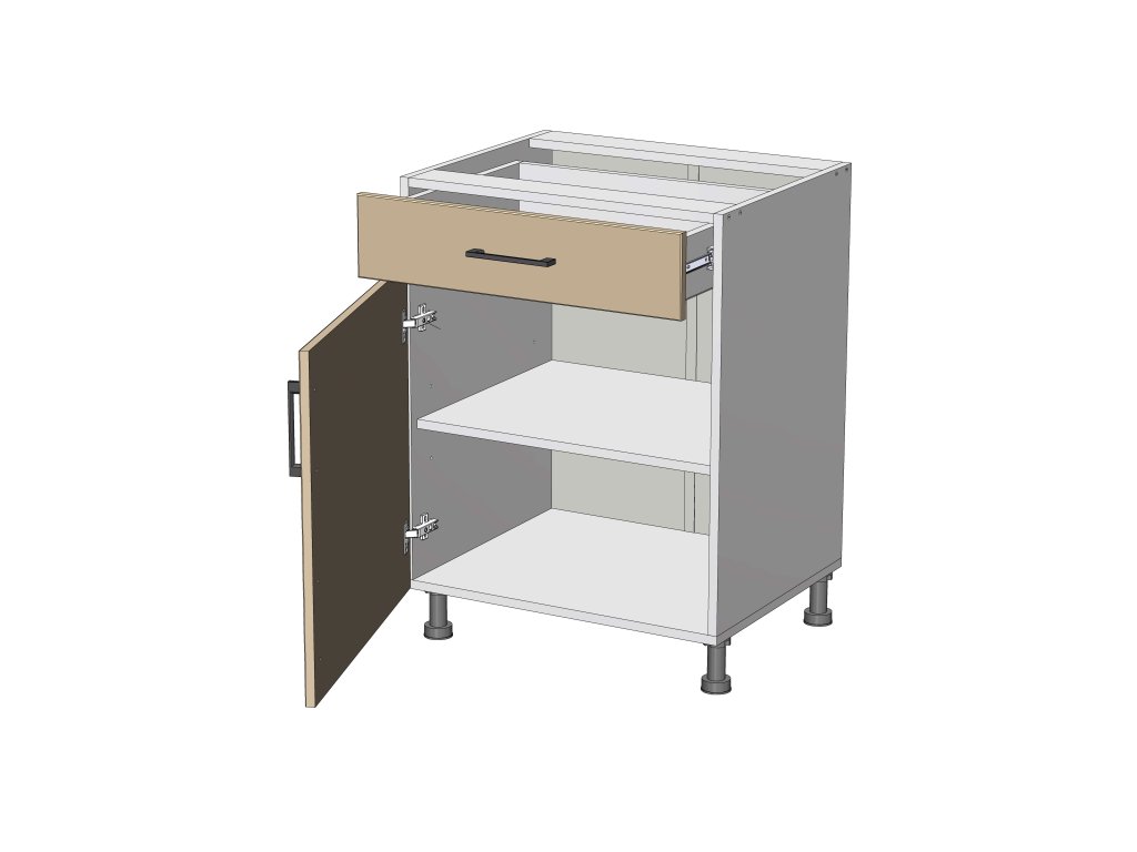 Dolní skříňka se šuplíkem, šířka 60 cm, 1 šuplík, 1 dvířka antracit, grafit korpus. Náleží do kuchyňské sektorové řady Modena. Účelně řešená skříňka s jedním šuplíkem vhodným pro příbory a dvířky pod tímto šuplíkem. Moderní levný kuchyňský sektor Modest je vyroben z odolného LTD. V ceně je příslušné kování. Z jednotlivých skříněk je možno si vyskládat kuchyni na míru dle potřeb. Pracovní deska a soklová lišta jsou na výběr a objednávají se zvlášť. Nožky dolních skříněk mají výšku 10 cm a jsou v ceně skříňky. Nabízíme také nožky 15 cm. Úchytky ke skříňce se objednávají zvlášť. Na výběr je více než 10 typů úchytek, takže lze vybrat dle vašeho vkusu. Dvířka jsou již předvrtána na rozteč 128 mm.Doplňkové parametry