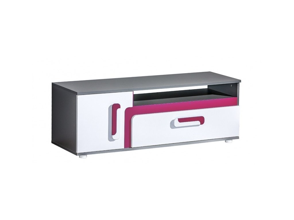 Televizní stolek APETTITA ze sektorové řady, která se vyznačuje netradičním zpracováním barev a originalitou úchytů. Tento styl nábytku zaujme každou mladší generaci. Nábytek je vyroben z kvalitní LTD desky hraněné ABS lištou. Korpus je v barvě šedá antracit, dvířka a čela zásuvek jsou bílé matné, doplňková barva je růžová. Úchytky jsou v barevné kombinaci růžová/bílá . Sektorový nábytek APETTITA má široký výběr prvků, který Vám zaručí sestavit si dětský nebo studentský pokoj, ložnici či kancelář podle svých potřeb, přání a představ. Dodáváme v demontovaném stavu.Doplňkové parametry