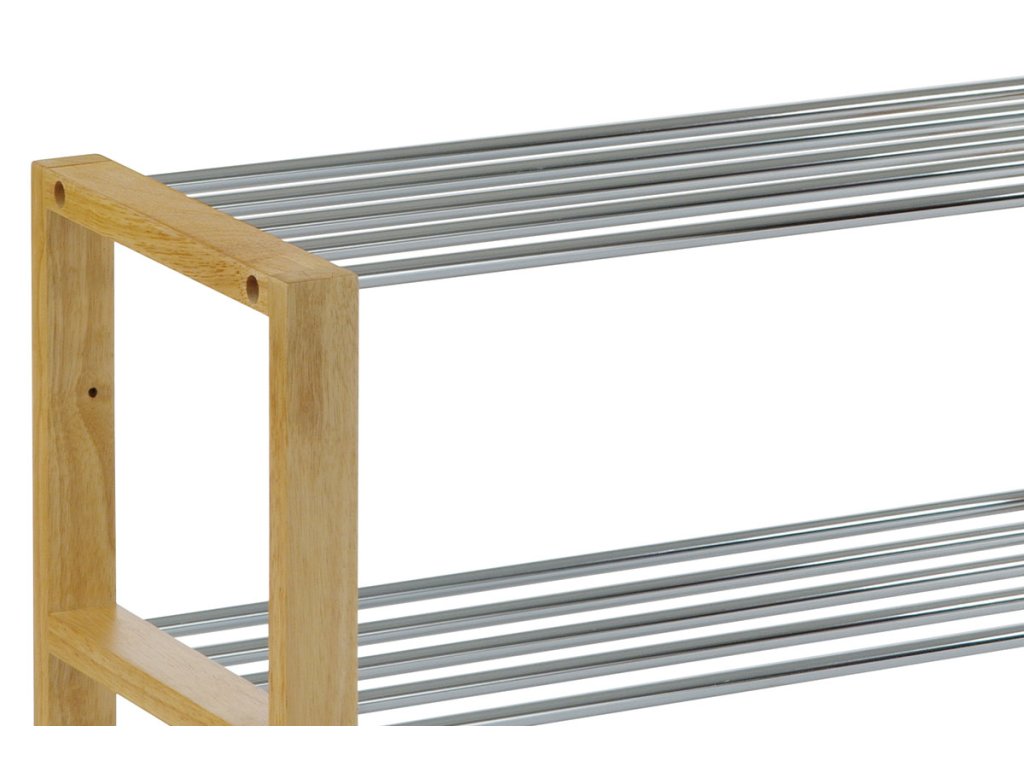 Botník s třemi chromovanými kovovými policemi a rámem z masivního kaučukovníku v přírodním odstínu nabízí praktické a stabilní řešení pro uskladnění obuvi. Pevné police zajišťují dostatek prostoru pro více párů bot, zatímco masivní dřevěný rám přispívá k celkové stabilitě a dlouhé životnosti. Povrchová úprava dřeva je hladká a přírodní, což podtrhuje jeho autentický vzhled a snadnou údržbu. Kompaktní rozměry umožňují umístění do předsíní i menších prostor, kde je potřeba efektivně využít místo. Botník kombinuje funkčnost s jednoduchým designem vhodným do různých interiérů.Doplňkové parametry