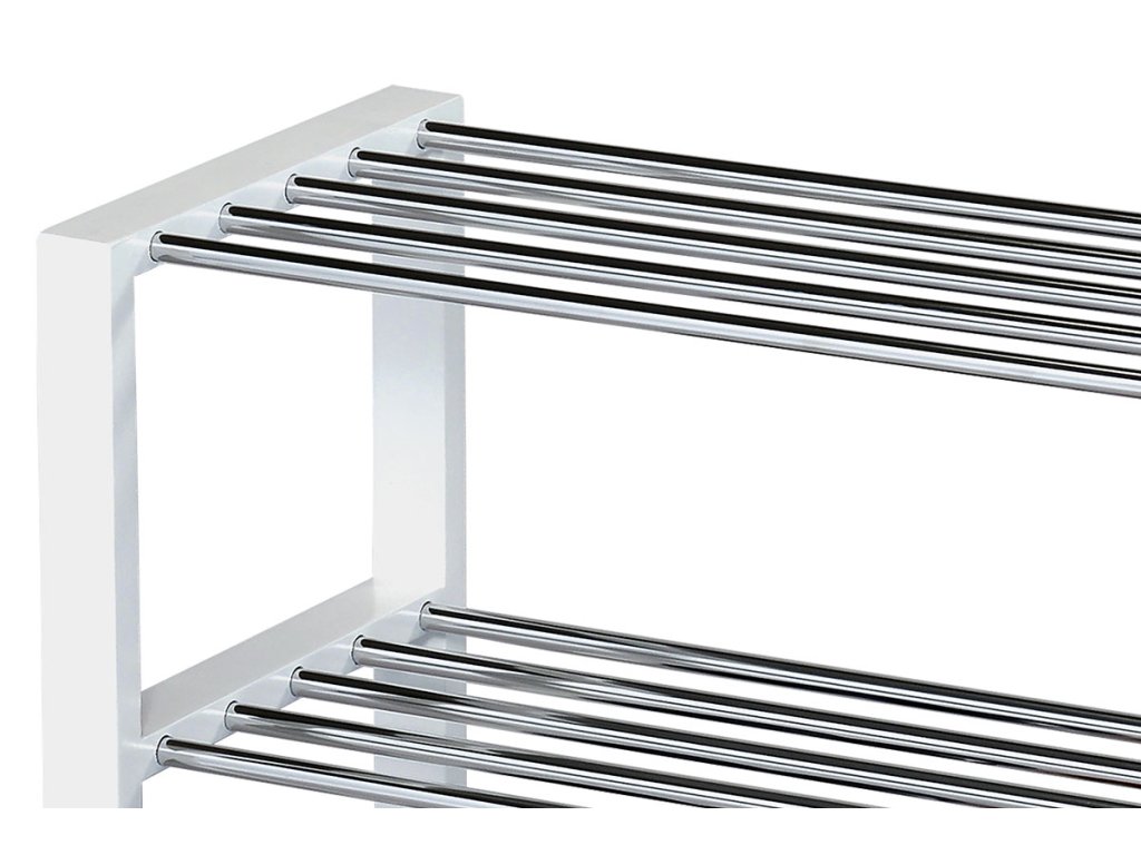 Botník s čtyřmi policemi z chromovaného kovu a rámem z masivního kaučukovníku v bílé matné barvě nabízí pevné a stabilní řešení pro uspořádání obuvi. Kovové police jsou odolné a snadno se udržují, zatímco masivní dřevěný rám zajišťuje dlouhou životnost a stabilitu celé konstrukce. Díky otevřenému designu je obuv dobře větratelná a přehledně uspořádaná. Botník je vhodný do předsíní i šaten, kde oceníte jeho kombinaci funkčnosti a jednoduchého moderního vzhledu. Rozměry a nosnost odpovídají běžným požadavkům na domácí použití.Doplňkové parametry