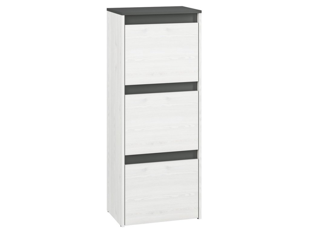 Botník se třemi výklopnými dvířky nad sebou je vyroben z desky LTD v kombinaci barev borovice sněžná/antracit. Dodáváme v demontovaném stavu.Doplňkové parametry