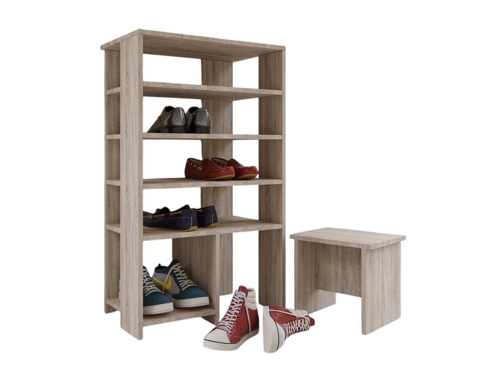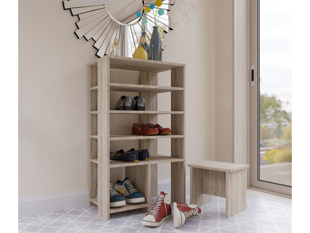 Policový botník se stoličkou v moderním provedení. Stoličku lze schovat do botníku. Botník je vyroben z kvalitního LTD v barvě dub sonoma. Dodáváme v demontovaném stavu.Doplňkové parametry