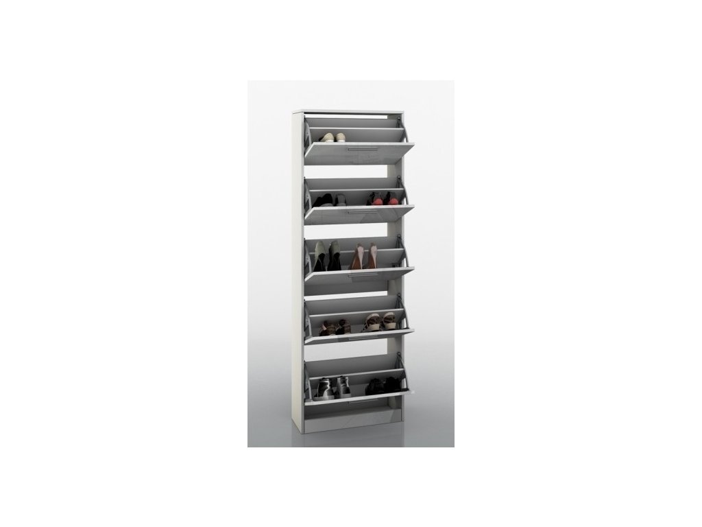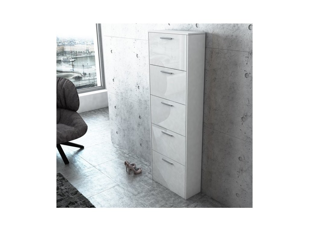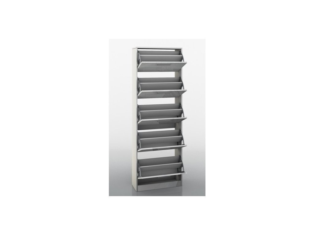 Pětidveřový výklopný botník v moderním provedení. Korpus z lamina je v barvě matná bílá, dvířka z MDF jsou v bílém lesku. Lamino i MDF jsou odolné vůči vysokým teplotám, poškrábání a nárazům. Dodáváme v demontovaném stavu.Doplňkové parametry