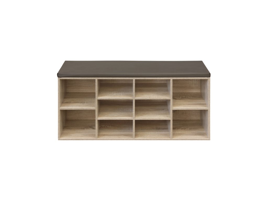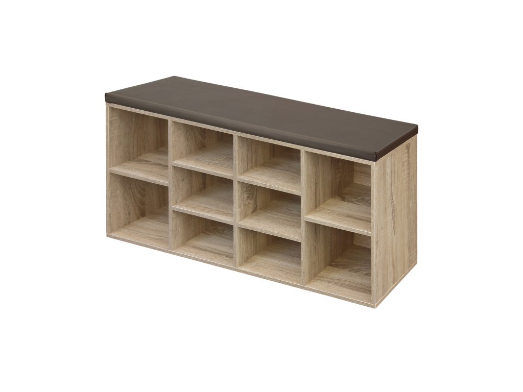 barevné provedení dub Sonoma polstrovaný sedák, deset polic potah sedáku kůže – imitace, barevné provedení hnědá větší police (š/h/v) 24,2 × 29 × 21 cm menší police (š/h/v) 24,2 × 29 × 13,8 cm doporučená nosnost 200 kgDoplňkové parametry