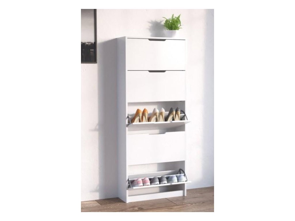 Výklopný botník v moderním provedení. Korpus z lamina je v barvě matná bílá, dvířka z MDF také v bílém matu. Lamino i MDF jsou odolné vůči vysokým teplotám, poškrábání a nárazům. Dodáváme v demontovaném stavu.Doplňkové parametry