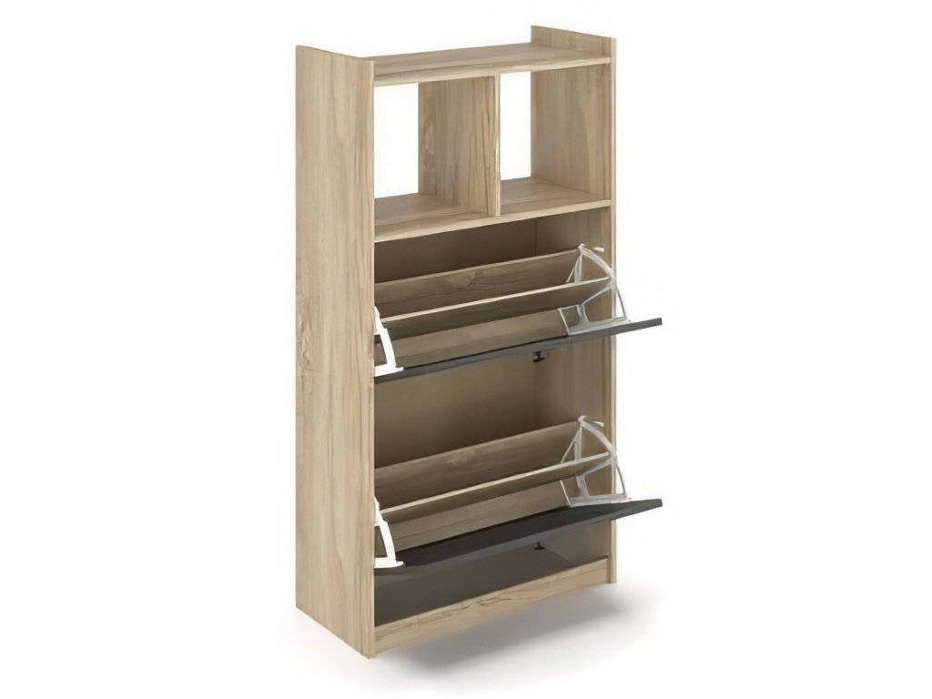 Botník se dvěma výklopnými dvířky, vyrobený z desky LTD v barveném provedení dub sonoma. Výklopná dvířka jsou v barvě šedá. K botníku je možné dokoupit látkové organizéry v šedé barvě. Dodáváme v demontovaném stavu.Doplňkové parametry
