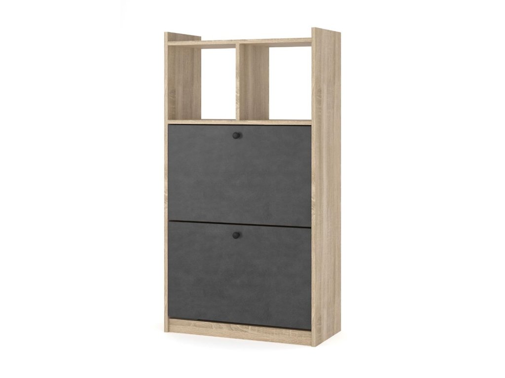 Botník se dvěma výklopnými dvířky, vyrobený z desky LTD v barveném provedení dub sonoma. Výklopná dvířka jsou v barvě šedá. Součástí regálu jsou také 2 ks látkové organizéry v šedé barvě. Dodáváme v demontovaném stavu.Doplňkové parametry