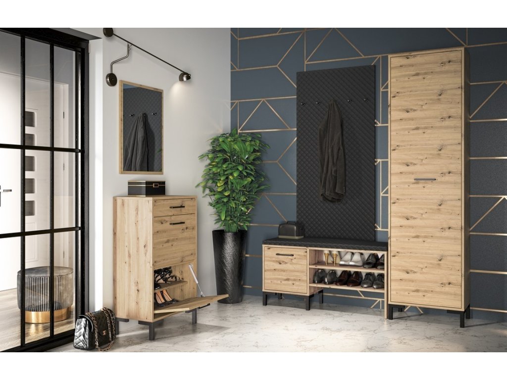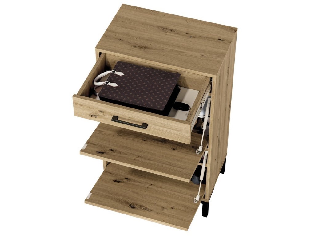 Botník s výklopnými dvířky je vyroben z desky LTD v barvě dub artisan. V horní části je praktická zásuvka. Úchyty jsou plastové. Možnost dokoupení dalších segmentů. Dodáváme v demontovaném stavu.Doplňkové parametry