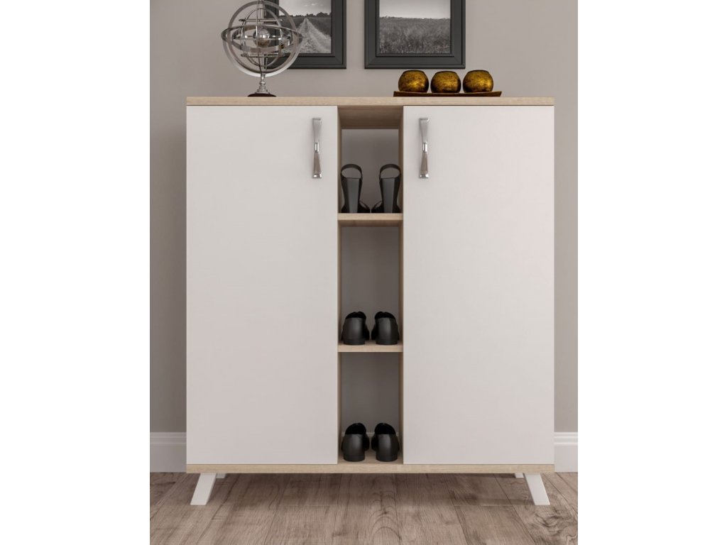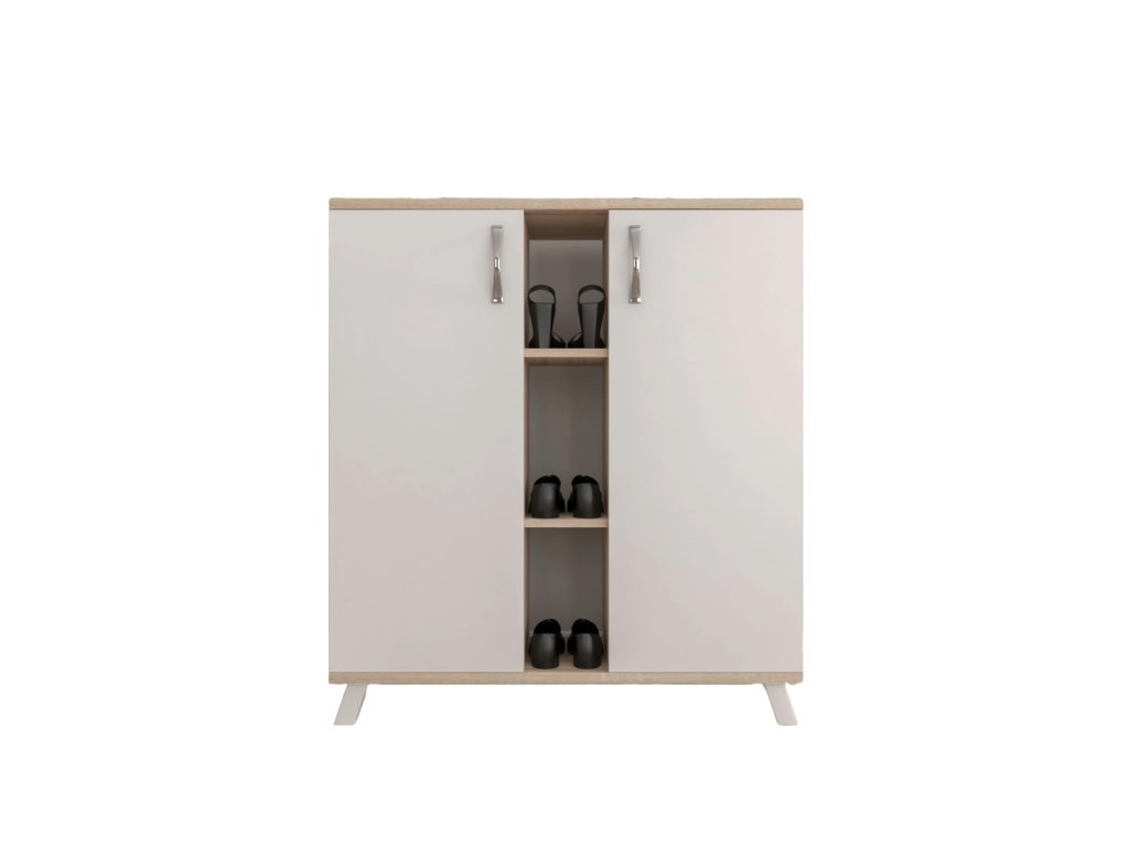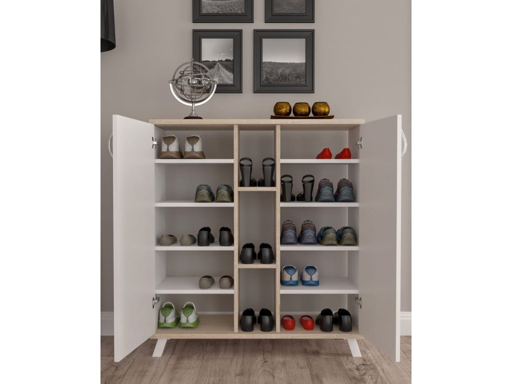 Elegantní úložné řešení v barvě dubu Sonoma a bílé Výška: 112 cm Šířka: 114 cm Hloubka: 38 cm Botník je vybaven 2 dvířky, za kterými se nachází 4 police pro uspořádání vašich bot. Uprostřed jsou praktické volné regálky pro snadný přístup a uskladnění. Stojí na nožičkách, což usnadňuje údržbu podlahy pod ní. Vyrobena z kvalitní dřevotřísky potažené melaminem. Dodáváme v demontovaném stavu.Doplňkové parametry