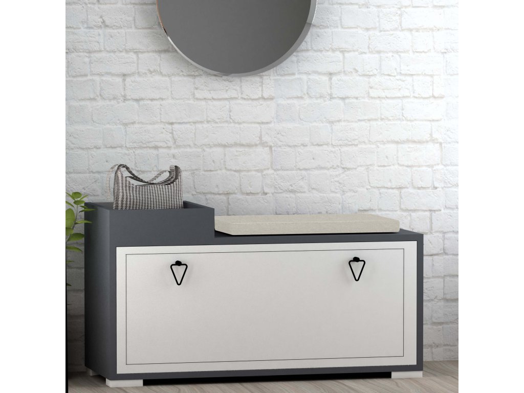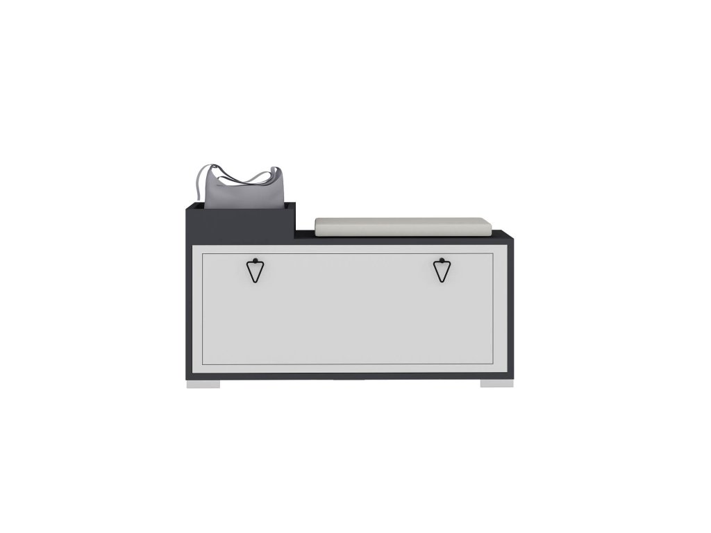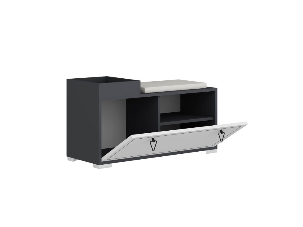 Botník je vyroben z kombinace kvalitního LTD materiálu a látky, což zajišťuje nejen pevnost, ale i pohodlí díky polštářku na sezení. Sedák není namontovaný na nábytku. Elegantní kovové úchytky a výklopné přihrádky přispívají k jeho modernímu vzhledu a funkčnosti. Dodáváme ho v demontu s plastovými nožičkami pro snadnou manipulaci a montáž.