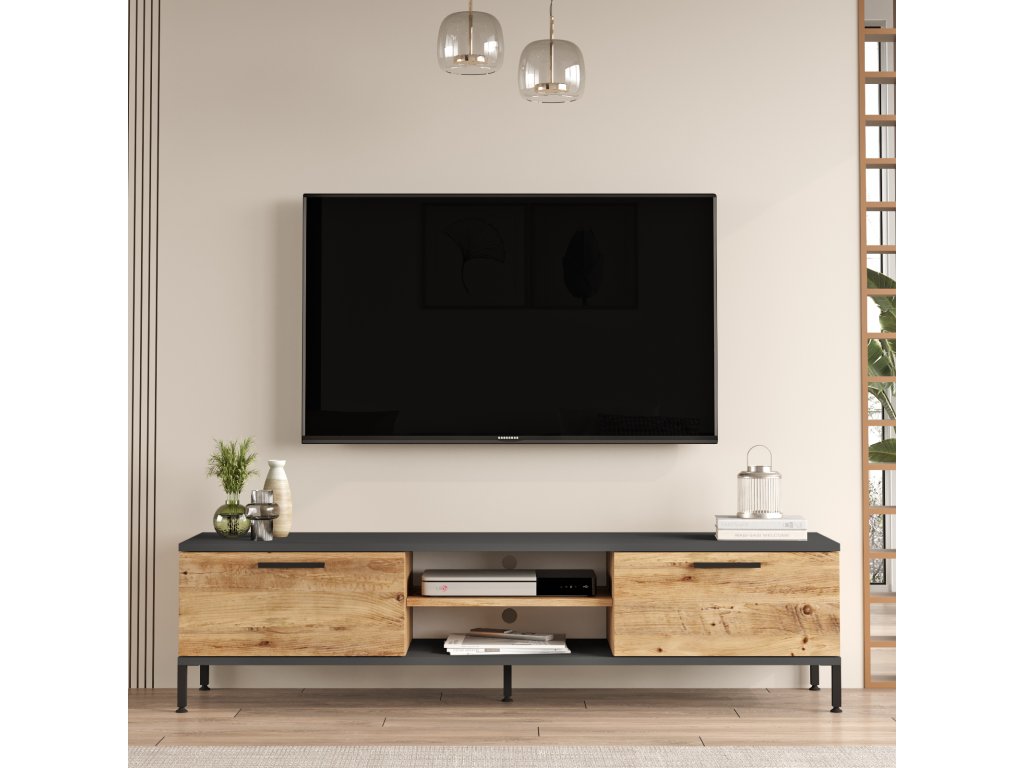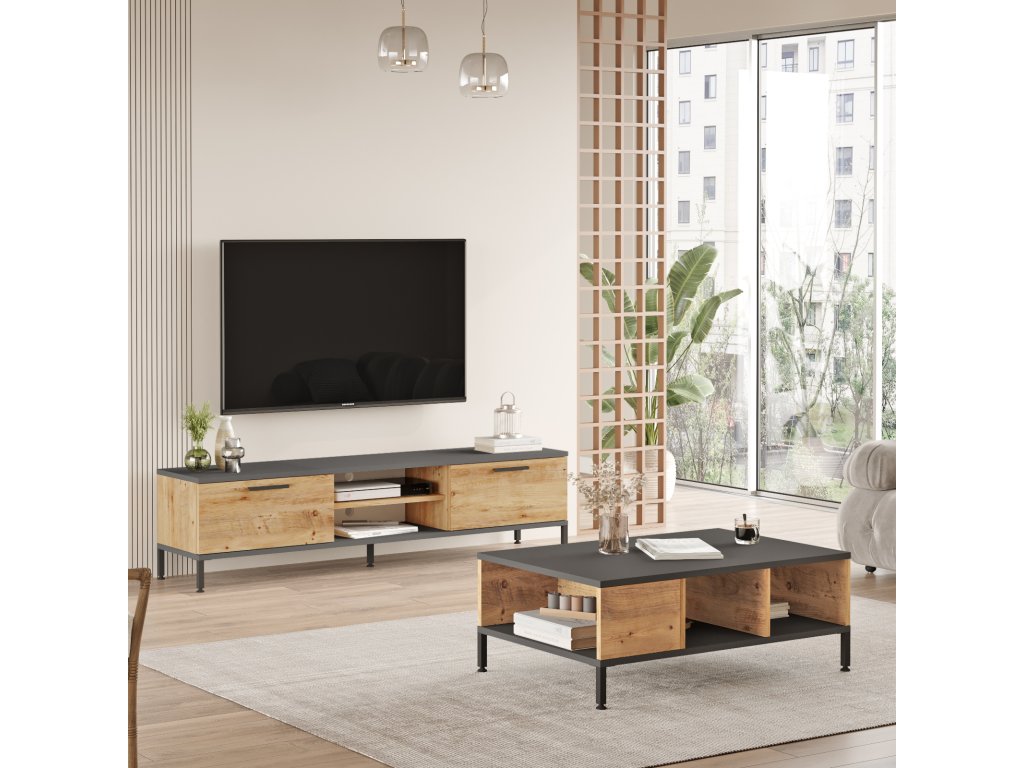 Obývací stěna je stylovým a praktickým řešením pro váš obývací pokoj. Kombinace kvalitního materiálu LTD a elegantní barevné kombinace borovice + antracit dodává interiéru moderní vzhled. Sestava obsahuje televizní stolek a konferenční stolek, které společně vytvářejí harmonický a funkční celek.