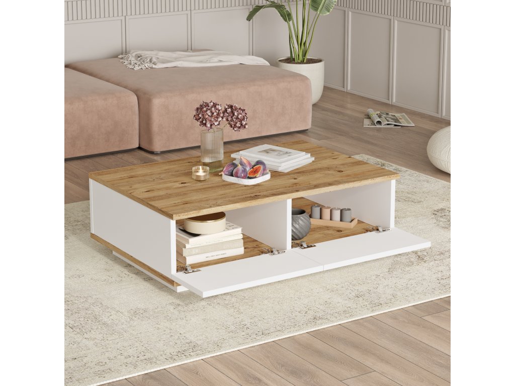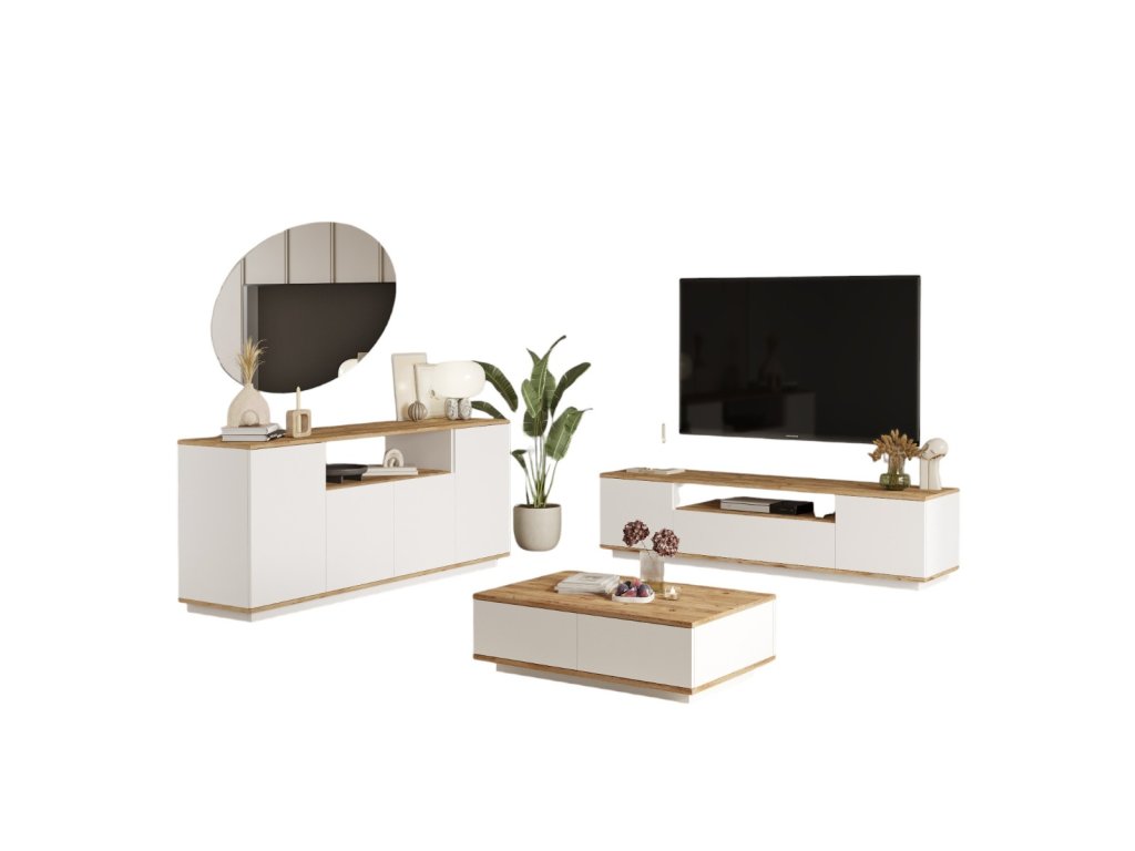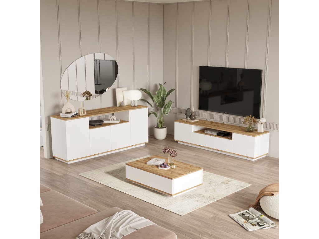 nabízí kombinaci praktických prvků a moderního designu. TV stolek poskytuje dostatek místa pro televizní a multimediální zařízení, konferenční stolek je ideálním doplňkem pro odkládání knih nebo občerstvení a prostorná komoda nabízí úložné řešení pro vaše věci. Díky světlým barvám a kvalitnímu zpracování se tento set stane oblíbenou součástí vašeho obývacího pokoje.