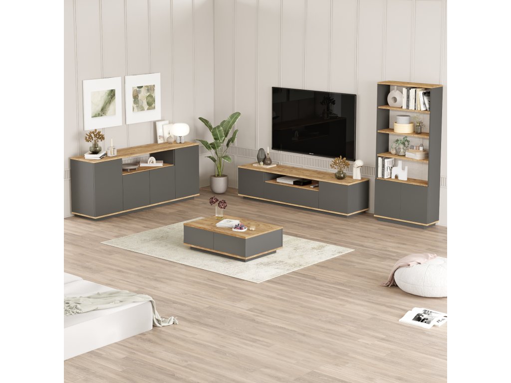 přináší praktické a estetické řešení pro organizaci vašeho obývacího prostoru. TV stolek poskytuje dostatek prostoru pro multimediální zařízení, konferenční stolek slouží jako ideální místo pro dekorace nebo občerstvení, prostorná komoda zajišťuje úložný prostor pro nezbytnosti a knihovna nabízí elegantní místo pro knihy, dekorace nebo rostliny.