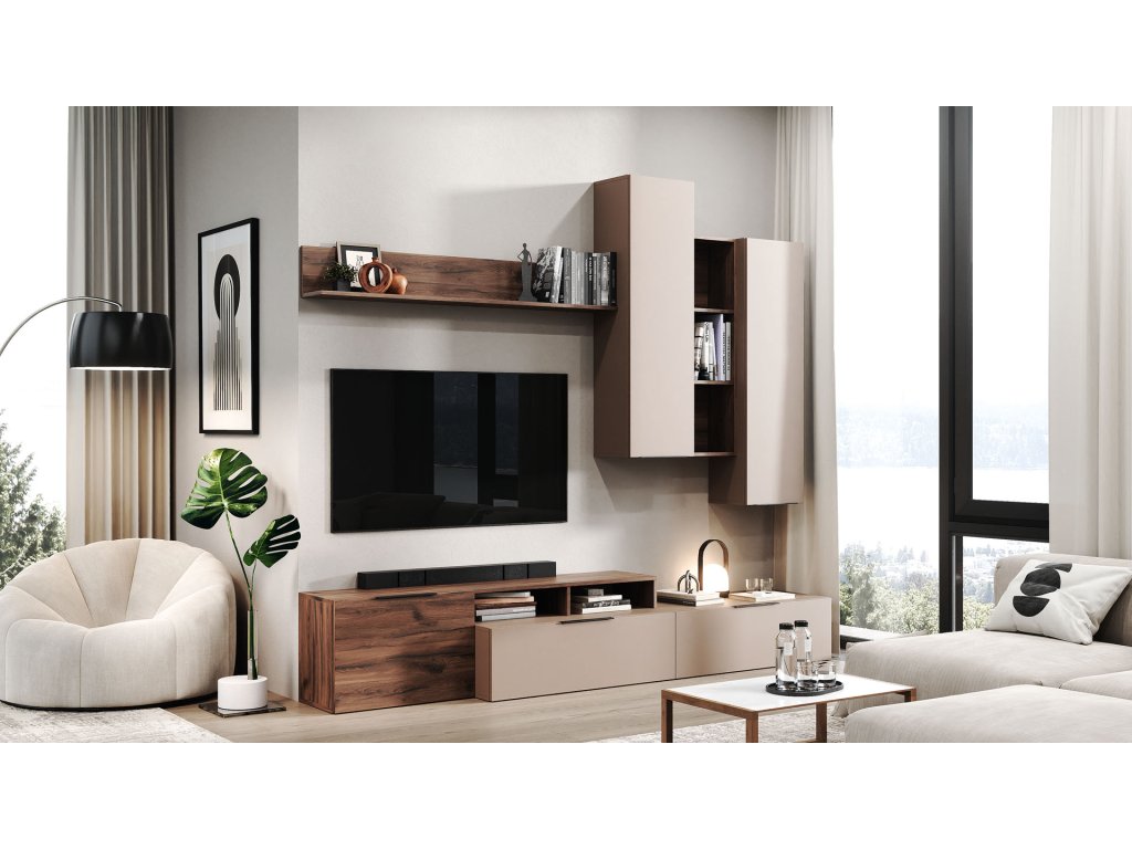 Obývací stěna je vyrobena z 16 mm laminované desky, která je známá svou odolností a dlouhou životností. Přední čela v barvě toffi zdobí elegantní černé úchyty.