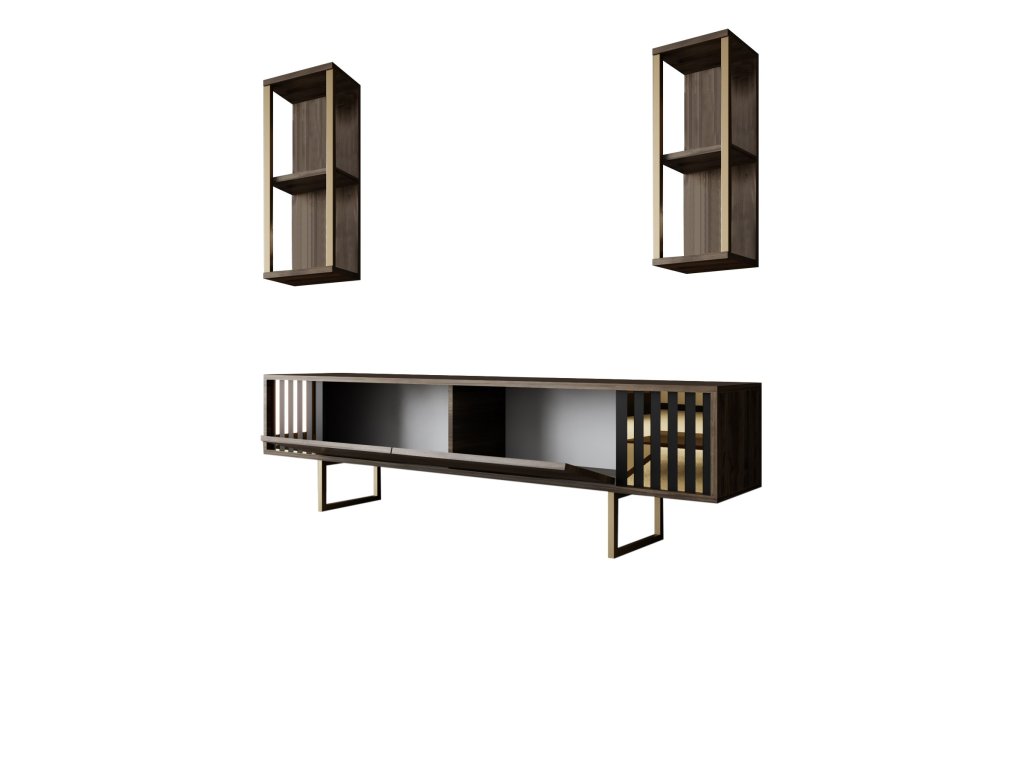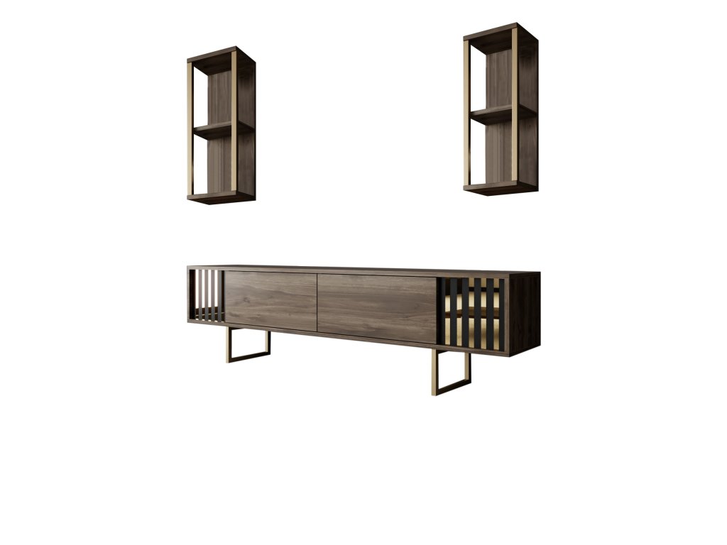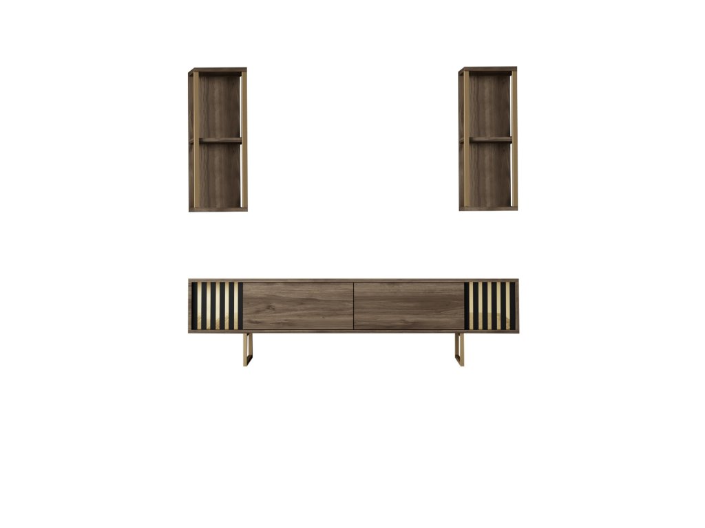 Elegantní design naší televizní skříňky dodá každé místnosti nádech elegance. Kombinace barvy ořechu a černé vytváří moderní a sofistikovaný vzhled, díky čemuž je perfektním doplňkem vašeho obývacího pokoje.