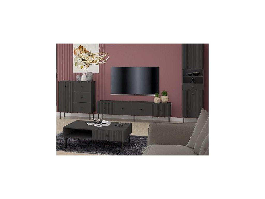Sestava do obývacího pokoje v elegantním stylu, je vyrobena z kvalitní LTD desky v barevném provedení antracit. Přední část nábytku je doplněna dekorem frézovaných dveří. Vysoké kovové nožky nábytku a úchyty jsou v barevném provedení antracit. Sestava se skládá z těchto položek (Š x V x H cm): - komoda se zásuvkami (91 x 98 x 42 cm) - televizní stolek (180 x 48 x 42 cm) - vitrína dvoudveřová (47 x 193 x 42 cm). V naší nabídce naleznete více variant nábytku této řady. Dodáváme v demontovaném stavu.Doplňkové parametry