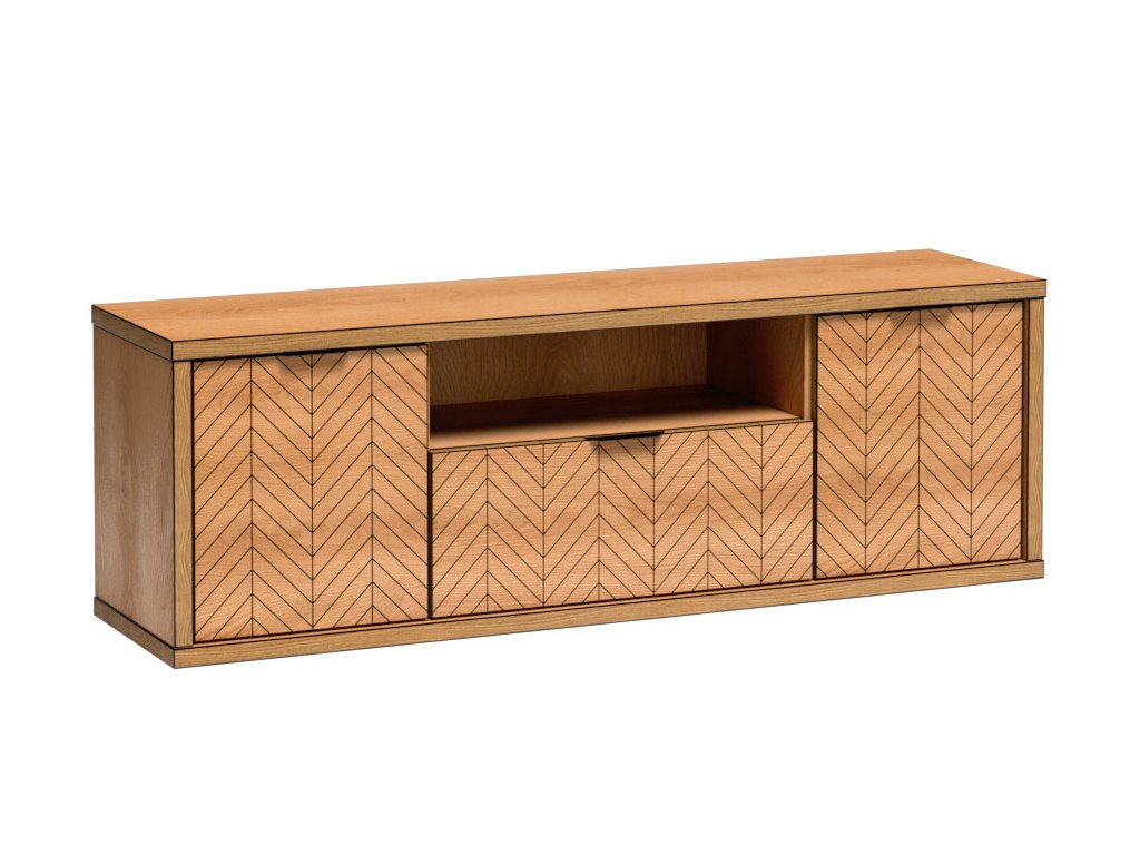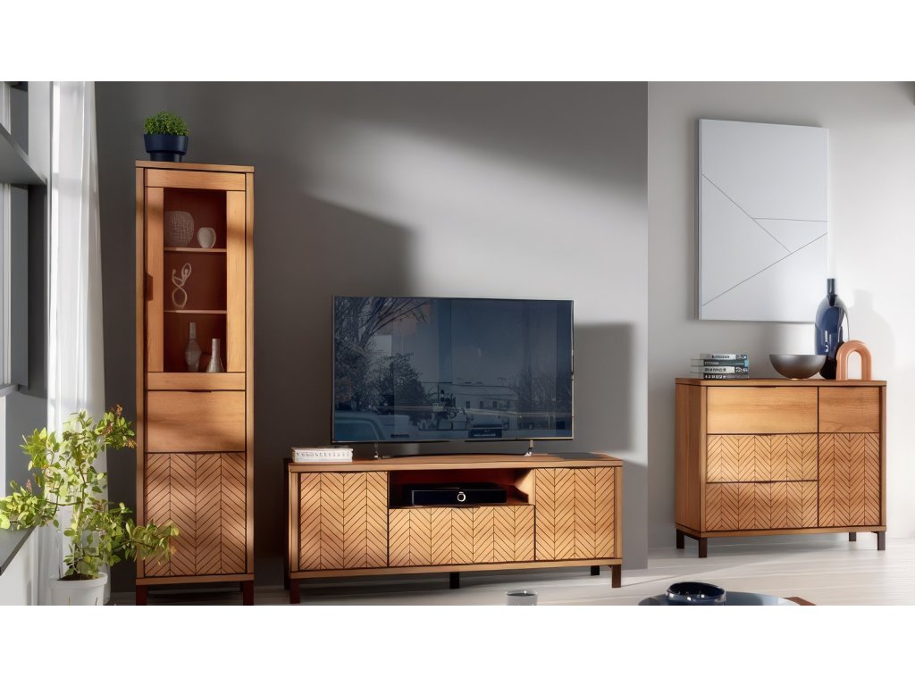 Obývací sestava: komoda 1-dveřová se 3 zásuvkami, vitrína 2-dveřová se zásuvkou a televizní stolek 2-dveřový se zásuvkou a úložným prostorem.