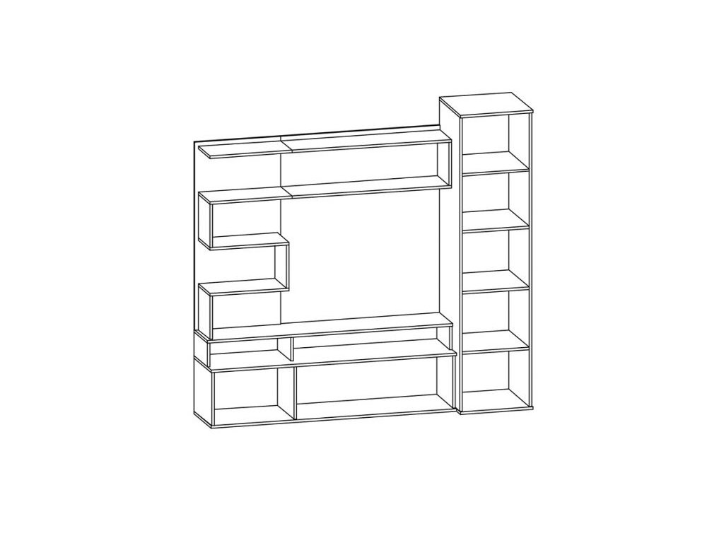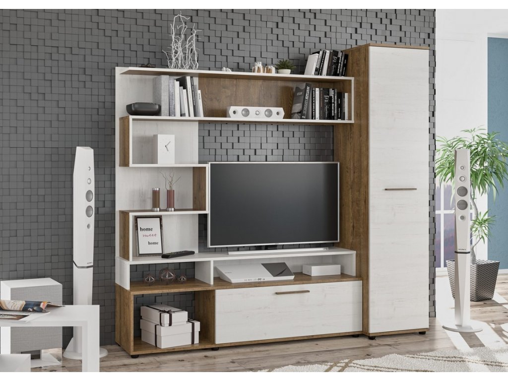 Sestava do obývacího pokoje v moderním provedení je vyrobena z kvalitní LTD desky v barevné kombinaci dub april/anderson. Sestava se skládá z televizního stolku s policovou stěnou a policovou skříní. Volný prostor pro televizi činí 100,3 x 82,4 cm. Dodáváme v demontovaném stavu.