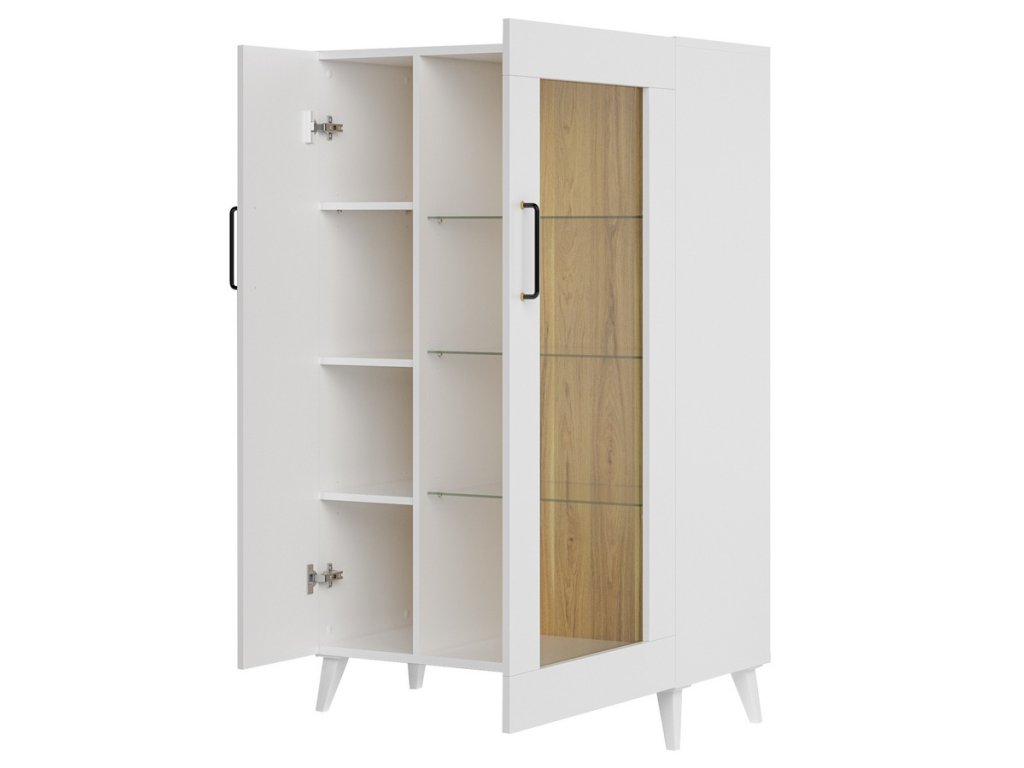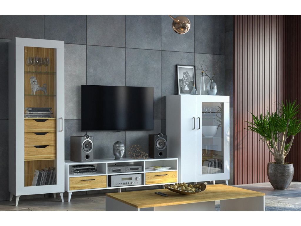 Obývací sestava je vyrobena z kvalitní desky LTD v barvě bílá mat, zadní vnitřní část vitríny je v barvě ořech americký světlý, dvířka jsou vyrobeny z desky MDF v barvě bílá mat, čela zásuvek jsou v barvě ořech americký světlý. Sestava se skládá z těchto položek (Š x V x H cm) - vitrína jednodveřová (60 x 200 x 42 cm), vitrína dvoudveřová nízká (86 x 137 x 42 cm) a televizní stolek dvoudveřový (160 x 48 x 42 cm). Úchyty jsou kovové v černé barvě zakončené zlatými prvky, nožky jsou plastové bílé. Dodáváme v demontovaném stavu.Doplňkové parametry
