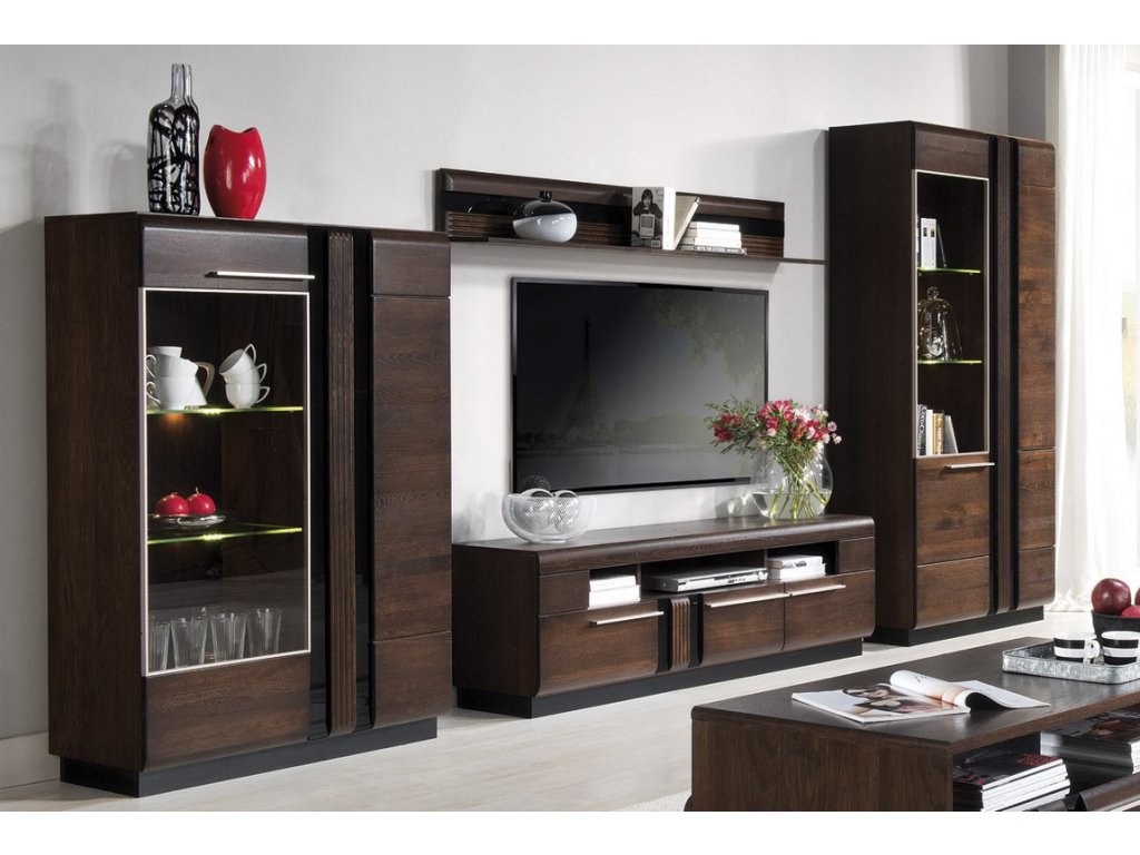 Obývací sestava z exkluzivní kolekce navržena v moderním duchu. Struktura ušlechtilého masivního dubu na přední straně a přírodní dýha na korpusu zdůrazňuje velmi klasickou barvu čokoládový dub. Opakující se prvek riflování v kombinaci s černým sklem je dekorační motiv, který se odráží v každém bloku. Sestava se skládá z těchto čtyř položek (Š x V x H) - vitrína vysoká (95 x 198 x 42 cm), televizní stolek (160 x 51 x 42 cm), závěsná police (160 x 23 x 25 cm) a vitrína nízká (95 x 145 x 42 cm). LED osvětlení vitrín lze dokoupit. Použitelnost alternativního spínače zjednoduší každodenní používání a osvětlený vnitřek vybraných bloků přinese ještě více energie a radosti v každodenním životě a nenápadně upozorní na povahu exponovaných prvků. Celá řada se vyznačuje elegancí a jednoduchými tvary, které zaručují plné využití prostoru. Barevné provedení - čokoládový dub. Elegantní úchyty jsou z kovu. Dodáváme ve smontovaném stavu.Doplňkové parametry
