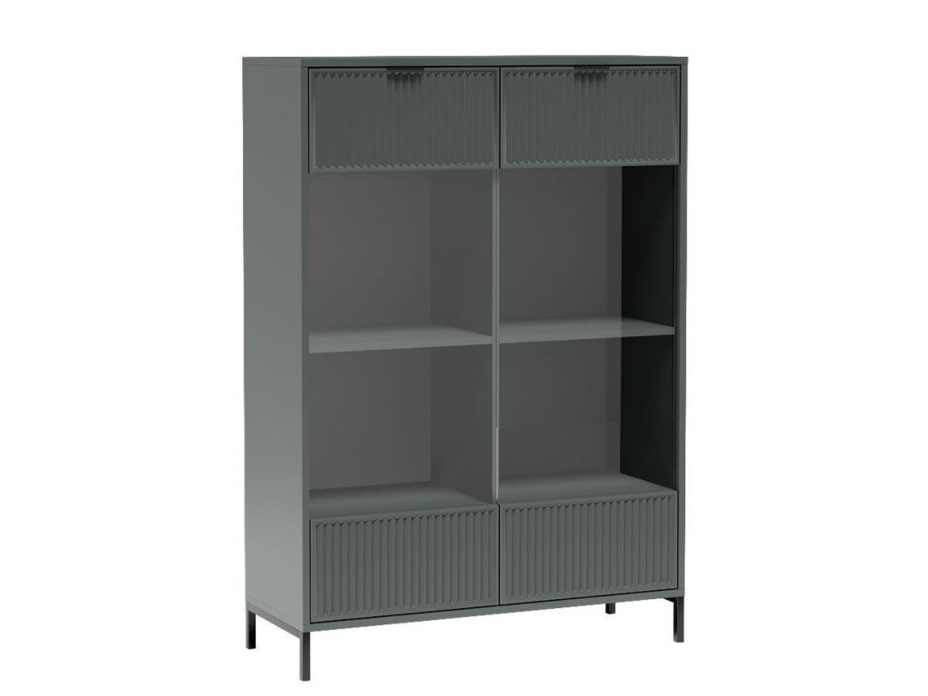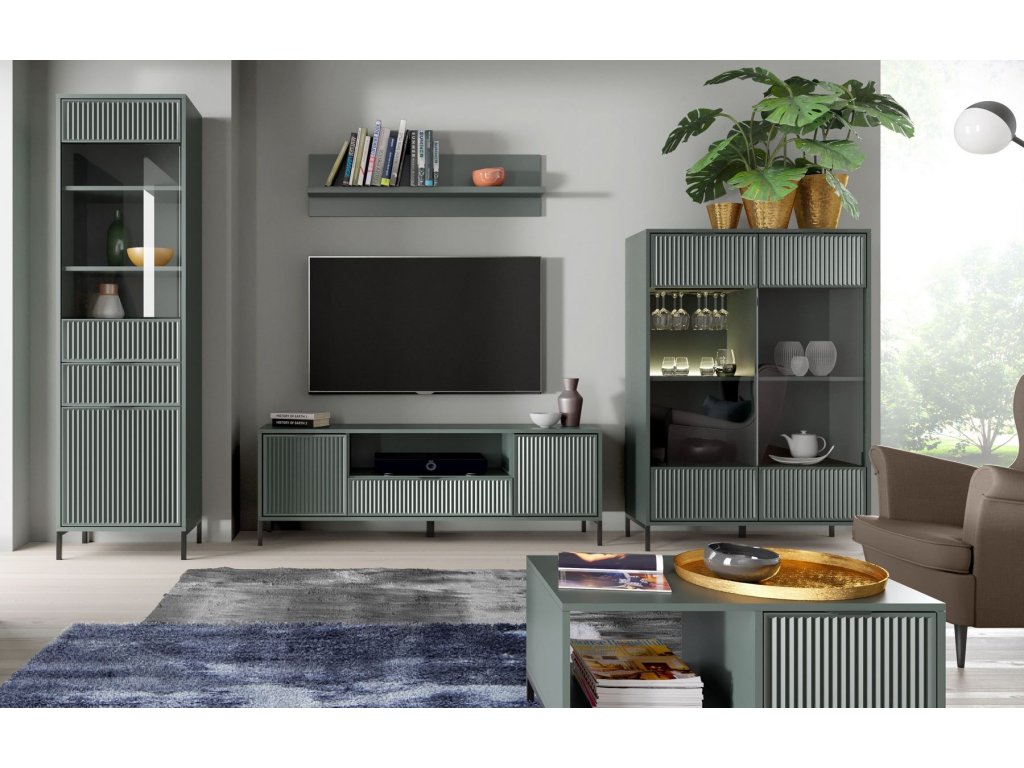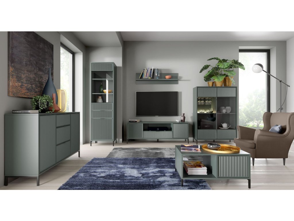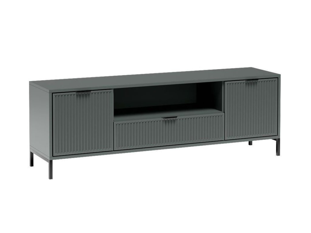 Nábytek je zdoben vzorem na čelních stranách v podobě frézovaných drážek. Všechny kusy nábytku z této kolekce stojí na černých kovových nožkách. Jednoduché a funkční tvary se hodí do obývacího pokoje, ložnice i jídelny.