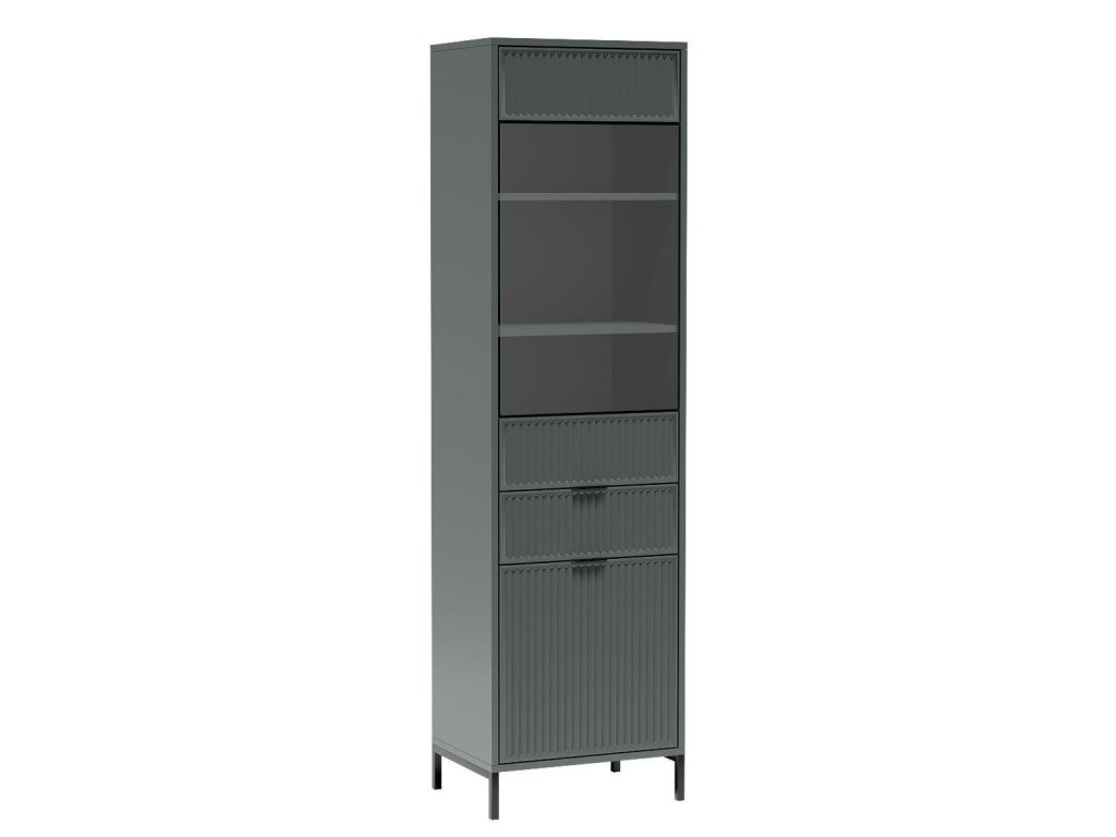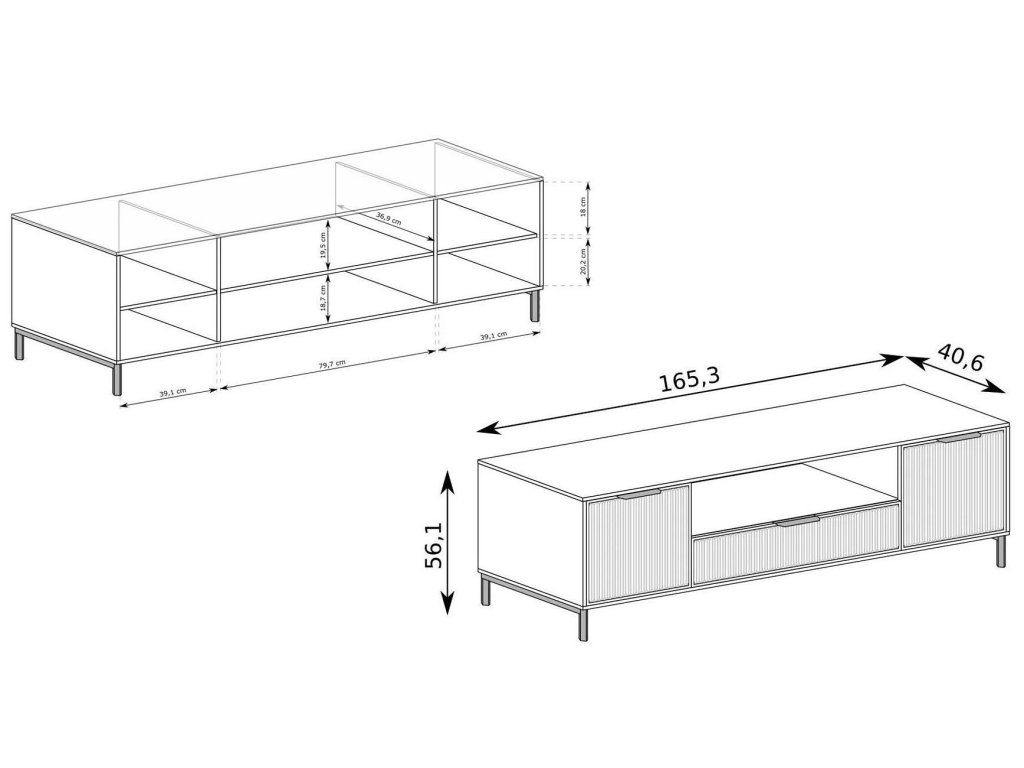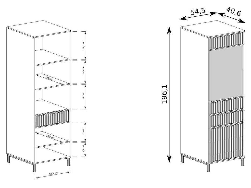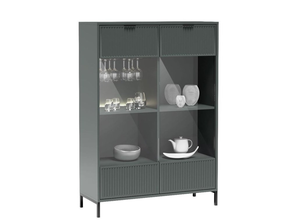 Nábytek je zdoben vzorem na čelních stranách v podobě frézovaných drážek. Všechny kusy nábytku z této kolekce stojí na černých kovových nožkách. Jednoduché a funkční tvary se hodí do obývacího pokoje, ložnice i jídelny.