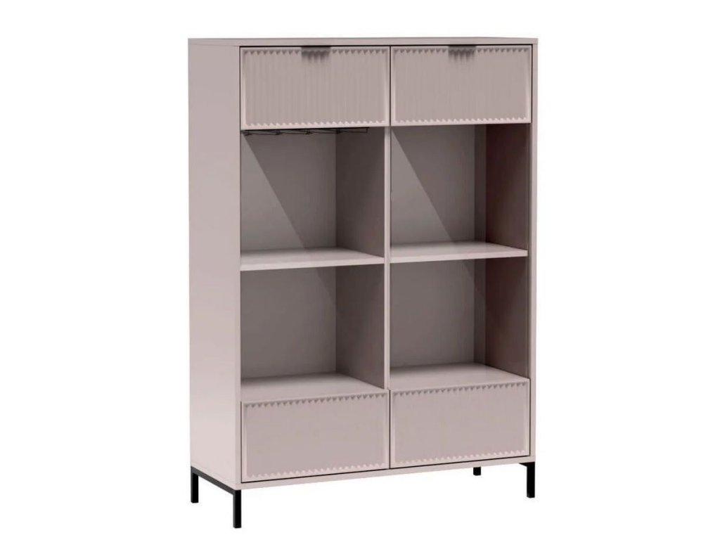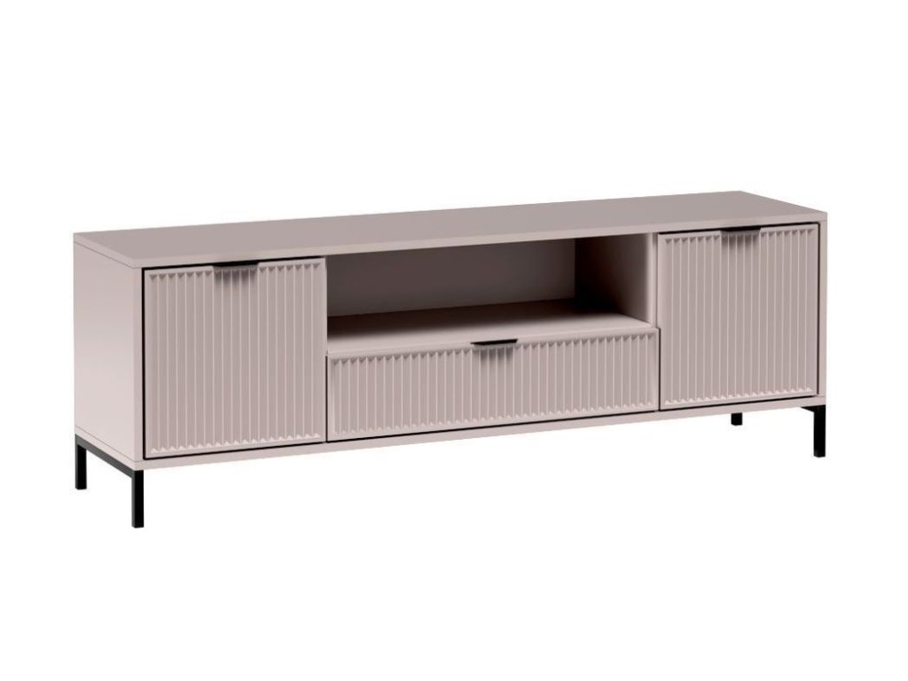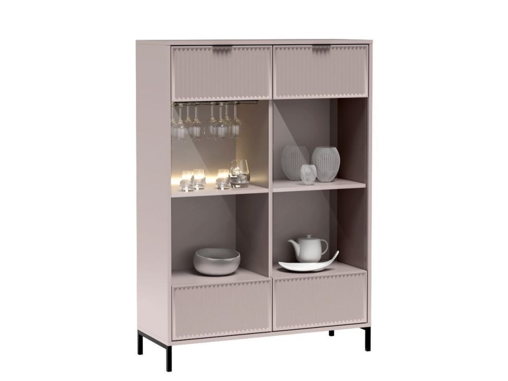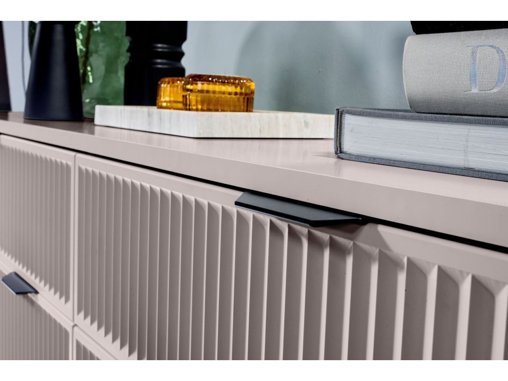 Nábytek je zdoben vzorem na čelních stranách v podobě frézovaných drážek. Všechny kusy nábytku z této kolekce stojí na černých kovových nožkách. Jednoduché a funkční tvary se hodí do obývacího pokoje, ložnice i jídelny.