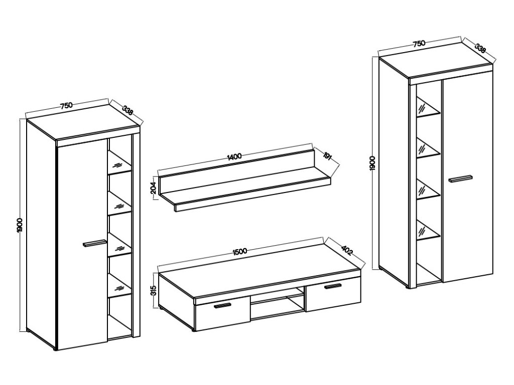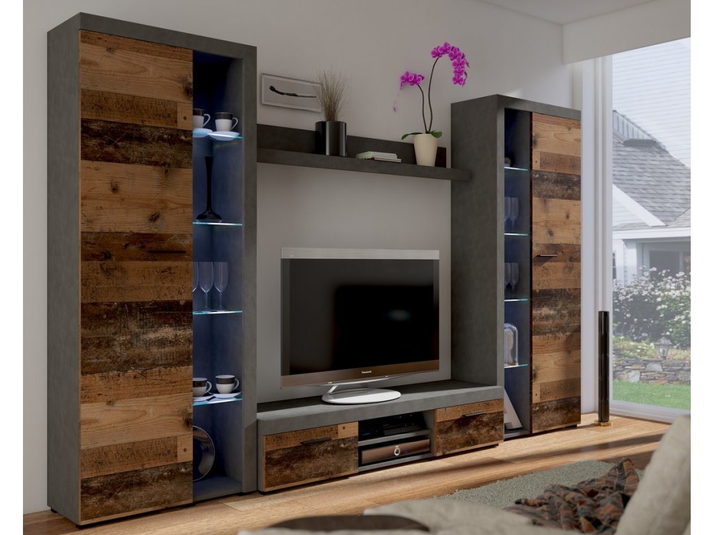Moderní obývací stěna, která si zakládá na nejnovějších trendech bydlení. Nábytek je vyroben z kvalitního lamina. Sestava se skládá z ( šířka/hloubka/výška ) - TV stolek ( 150 x 40,2 x 31,5 cm ), 2x vysoká vitrína ( 75 x 33,8 x 190 cm ) a police ( 140 x 17,6 x 16 cm ). Dvířka jsou v barvě lamina dub old style, korpus matera (černošedá). Tato stěna se prodává jako sestava, jednotlivé díly nelze koupit zvlášť. Ve vitrínách jsou skleněné police. LED osvětlení není v ceně, možnost dokoupení. Dodáváme v demontovaném stavu.Doplňkové parametry