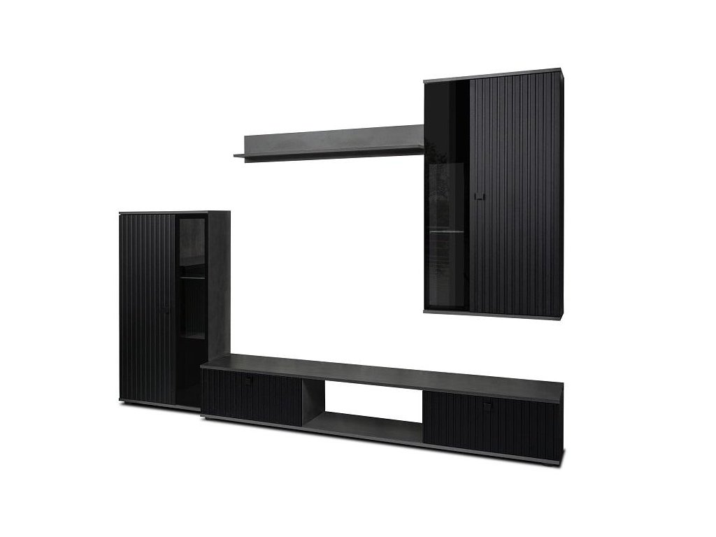 Moderní obývací stěna SALSA. Nábytek je vyroben z kvalitního lamina. Sestava se skládá z vitríny 59 x 31 x 115, TV stolku 176 x 40 x 28, závěsné vitríny 59 x 31 x 113 a police 102 x 18 x 16 cm. Obývací stěna je v barvě černá/matera. Sklo ve vitríně je čiré. Tato stěna se prodává jako sestava, jednotlivé díly nelze koupit zvlášť. Možnost doobjednání komody nebo LED osvětlení. Dodáváme v demontovaném stavu.Doplňkové parametry