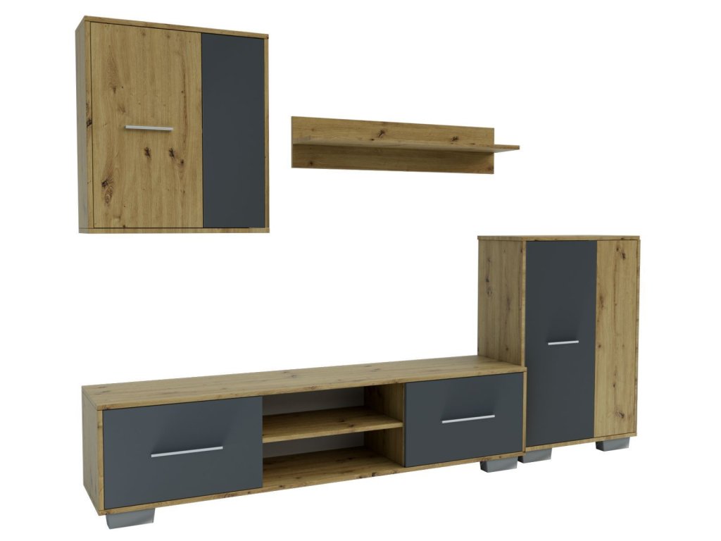 Moderní obývací stěna vhodná i do menších bytů. Tato sestava je vyrobena z kvalitního lamina. Sestava se skládá ( šířka/výška/hloubka ) - TV stolek ( 160 x 39 x 38 cm ), nástěnná skříňka ( 60 x 67 x 22 cm ), komoda ( 60 x 89 x 30 cm ) a police ( 90 x 19 x 19 cm ). Korpus a část předních dvířek je barvy dub artisan, dvířka jsou doplněna o barvu šedý grafit. Tato stěna se prodává jako sestava, jednotlivé díly nelze koupit zvlášť. Dodáváme v demontovaném stavu.Doplňkové parametry