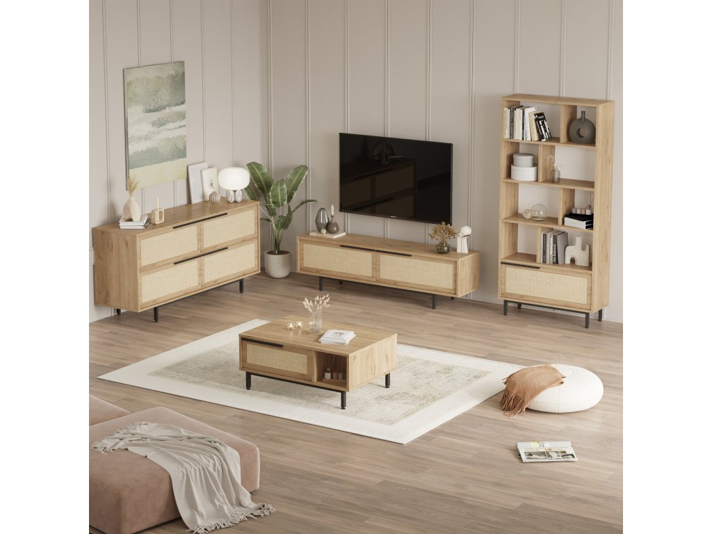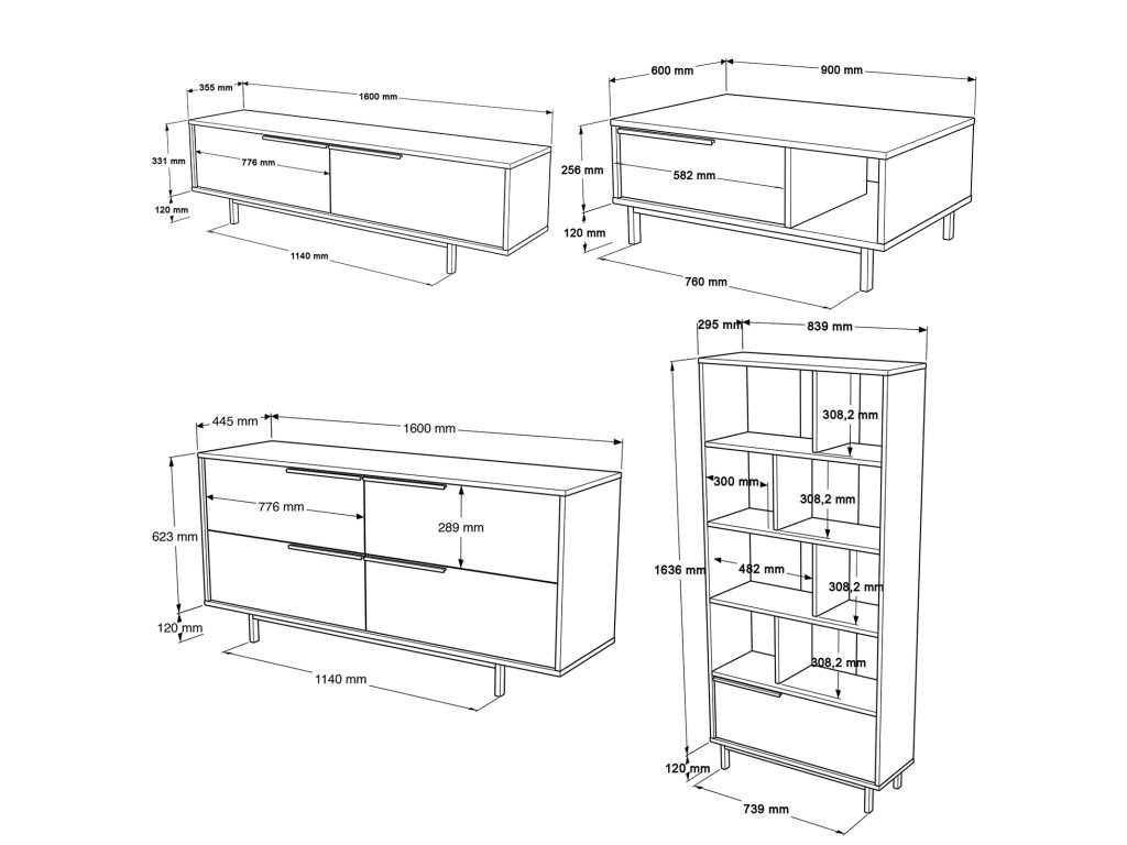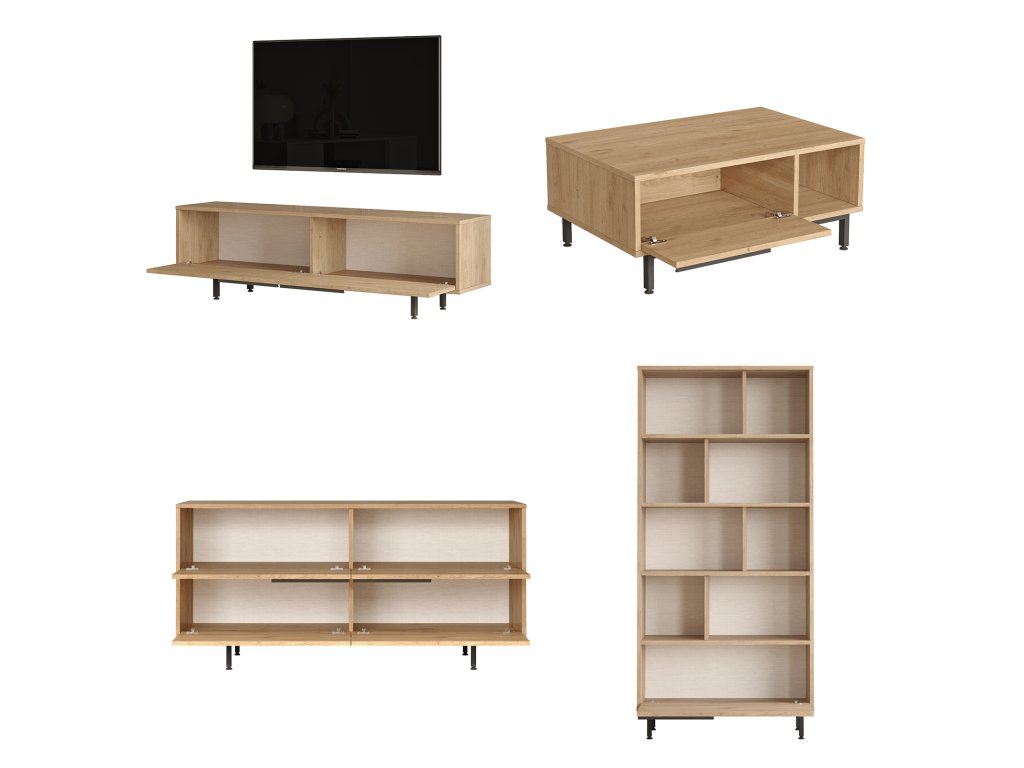 je navržena tak, aby splnila všechny vaše potřeby. Televizní stolek nabízí prostor pro multimediální zařízení, konferenční stolek slouží jako ideální místo pro občerstvení nebo dekorace, prostorná komoda poskytuje úložné místo pro různé předměty a knihovna je perfektním místem pro uložení knih, rostlin nebo dekorací. Díky preciznímu zpracování a modernímu designu se stane dominantou vašeho obývacího pokoje.