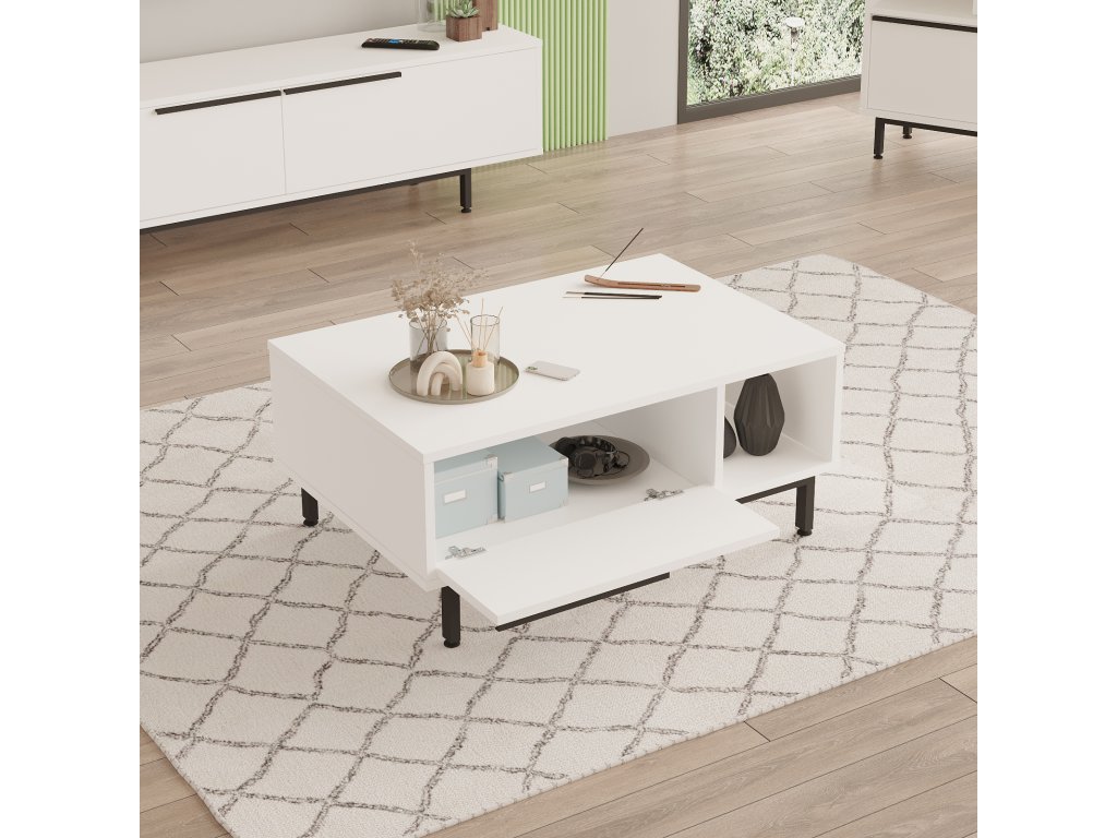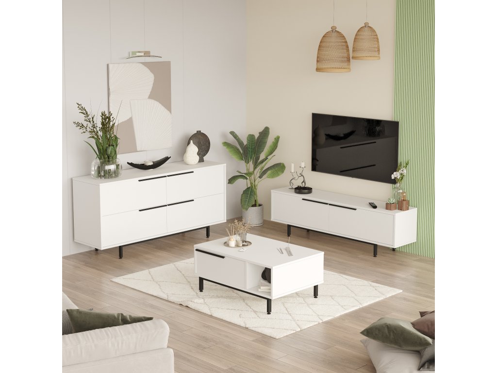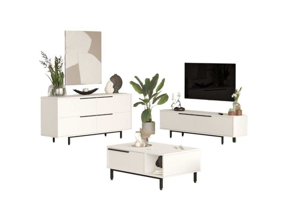 spojuje funkčnost a moderní design. Televizní stolek nabízí prostor pro elektroniku a multimediální zařízení, konferenční stolek je ideálním doplňkem pro odkládání občerstvení nebo dekorací a prostorná komoda poskytuje dostatek úložného prostoru pro organizaci vašich věcí. Díky preciznímu zpracování a elegantnímu vzhledu se tato sestava stane středobodem vašeho obývacího pokoje.