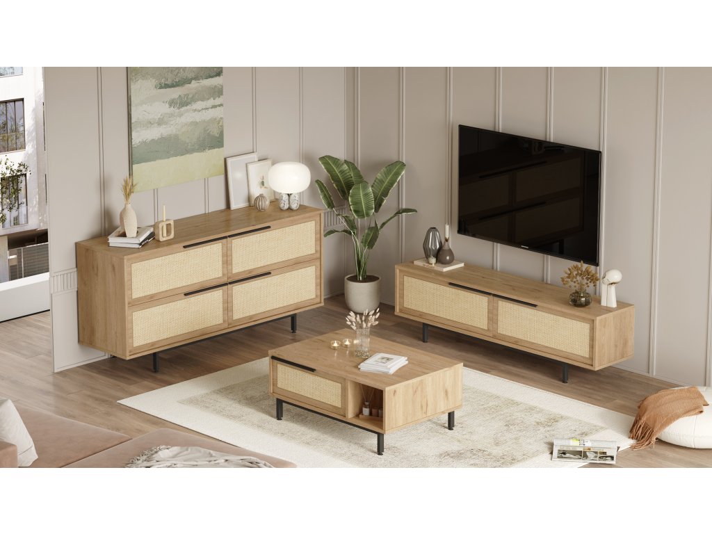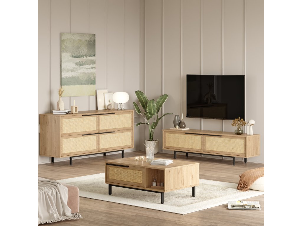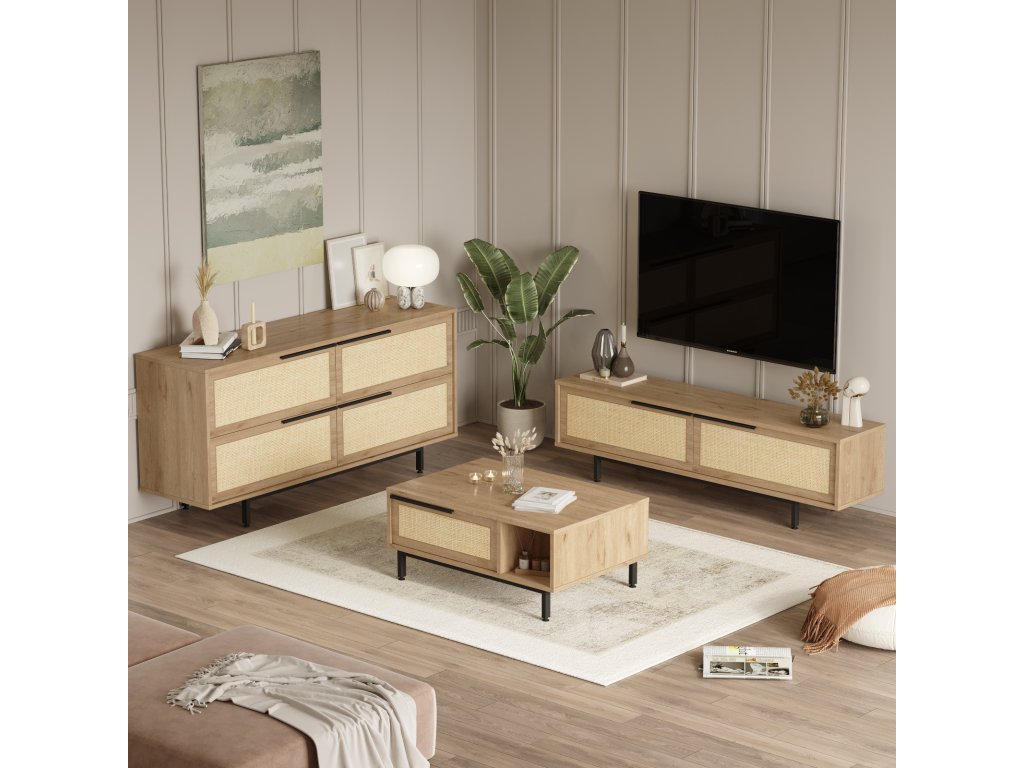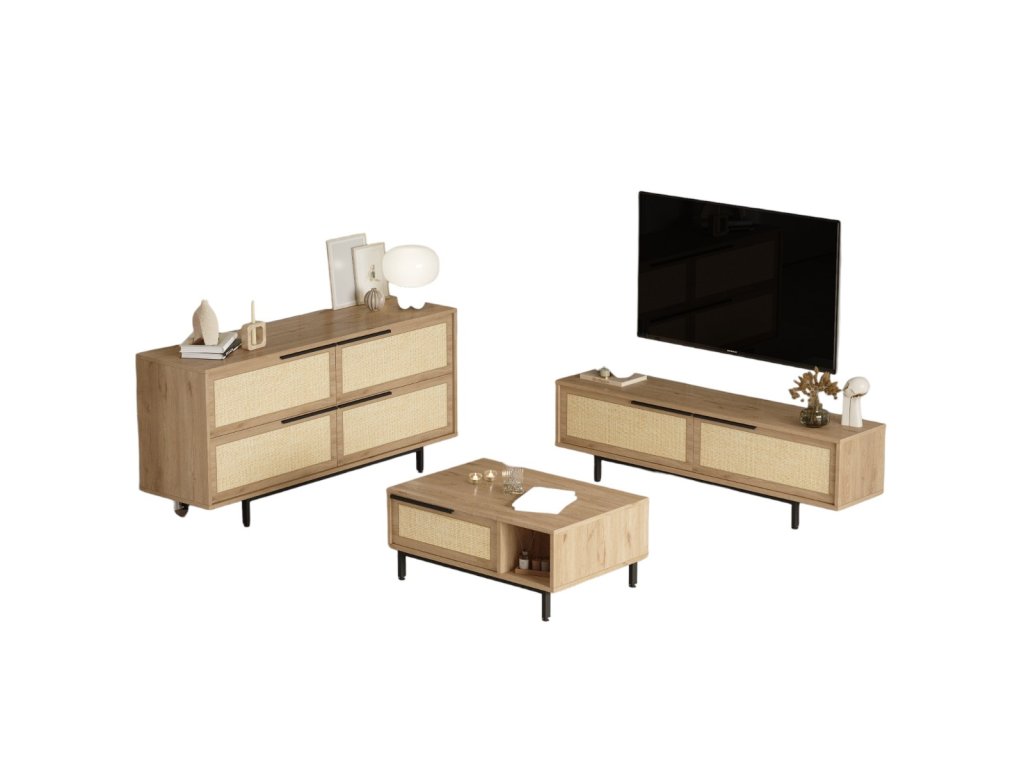 spojuje funkčnost a moderní design. Televizní stolek nabízí prostor pro elektroniku a multimediální zařízení, konferenční stolek je ideálním doplňkem pro odkládání občerstvení nebo dekorací a prostorná komoda poskytuje dostatek úložného prostoru pro organizaci vašich věcí. Díky preciznímu zpracování a elegantnímu vzhledu se tato sestava stane středobodem vašeho obývacího pokoje.